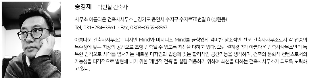| 송경제(松經齊) 설계자 | 박인철 + 김형중 교수 _아름다운 건축사사무소 + 배재대학교 건축학부 건축주 | 김의중 감리자 | 박인철 _ 아름다운 건축사사무소 시공사 | 박인철 _ 아름다운건축 설계팀 | 김미형 대지위치 | 경기도 양평군 서종면 화서로 582-2 주요용도 | 단독주택 대지면적 | 684.00㎡ 건축면적 | 101.86㎡ 연면적 | 134.52㎡ 건폐율 | 14.30% 용적률 | 23.43% 규모 | 지상 2층 구조 | 철근콘크리트 벽식구조 외부마감재 | 점토벽돌치장쌓기, 티타늄징크거멀접기 내부마감재 | 석고보드위퍼티마감, 대리석, 강화마루 설계기간 | 2018. 04 ~ 2018. 12 공사기간 | 2019. 02 ~ 2019. 09 사진 | 박정연 전문기술협력 - 구조분야 : 라임구조 + 아름다운 건축사사무소 - 기계설비분야 : 태영이엔씨 - 전기분야 : 태영이엔씨 - 소방분야 : 태영이엔씨 |