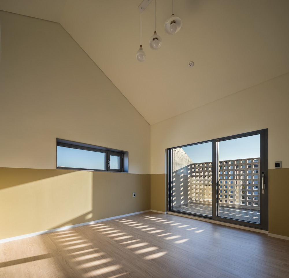 우선 1층 전체를 마당으로 해석해 거실 및 주방으로 이루어진 내부 생활공간과 외부 마당을 연계해 활용도를 높였다. 2층의 모든 방은 남향으로 배치하고 다락 진입 계단을 중심으로 부부 방과 자녀 방을 분리시켰으며, 부부 방에는 천정을 경사지붕 모양으로 시원하게 만들어 마스터 존으로서의 차별성을 부여했다. 전면 테라스에는 채광과 시선 차단이 가능하도록 큐블럭 차양벽을 설치했고, 딸이 거주하는 공간에는 남측 채광과 숲의 풍경을 고려해 ㄱ자형 창문을 만들었다. 아들 방은 측면 벽에 붙어있는 계단 하부를 미니하우스 공간으로 만들어 재미있는 놀이공간으로 이용토록 했다.