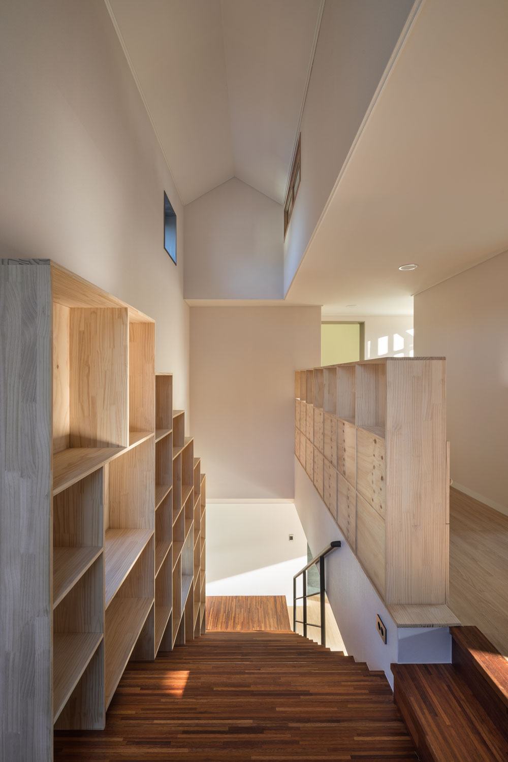 The stairway space from the first floor to the second floor has a section of a diagonal line, and the lower part has an alcove space on the sides of the stairs, the upper part of the stairs, the emotional connection with the rear forest through the gout, the upper ceiling of the slope roof, and the three-dimensional opening from the height of the second floor, etc.