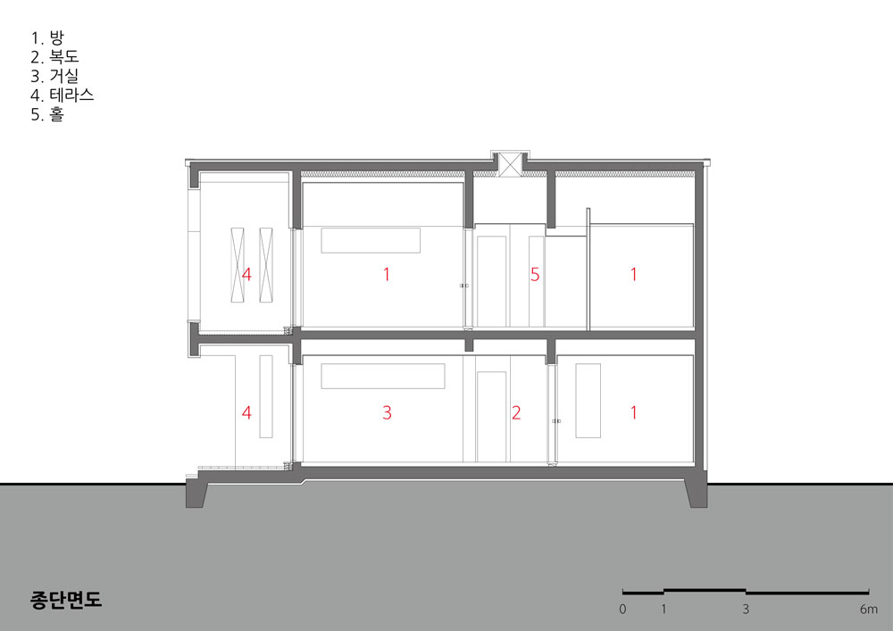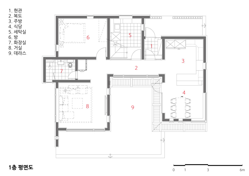 In order to organize the space where a family of three generations resides in 45 pyeong(149 m2) or less, the personal space is thoroughly divided, and the floor plan is designed with the motif of the traditional ㄷ-shaped structure of the traditional Hanok so that there is no obstacle to communal living through outdoor intermediate spaces such as a courtyard.