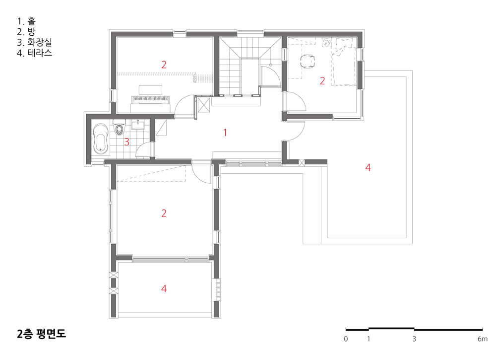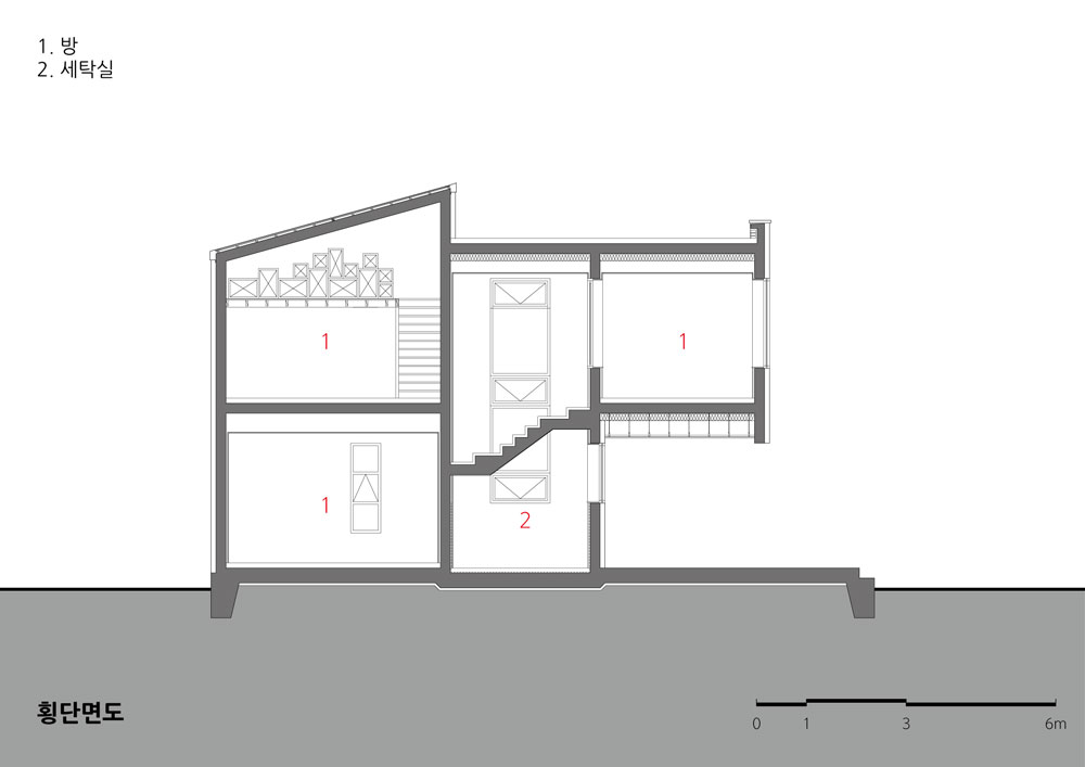 층별구성 _ 기본적인 층별구성은 1층 부모님(1세대) 공간과 2·3세대의 공용공간으로 구성하고, 2층은 2·3세대 전용공간으로 구분했다. 2층 가족실(공용공간)의 컴퓨터 책상에 앉아서 중정과 마당을 조망할 수 있으며, 2층 안방의 외부 테라스는 부부만의 전용 휴식공간으로 만들었다. 복층건물의 특성상 2층은 상대적으로 1층보다 덥기 때문에 대류의 흐름을 고려하여 계단실 최상부와 가족실 천정에 환기창을 설치했으며, 더운 공기를 배출하여 쾌적한 환경조성이 가능하도록 했다.