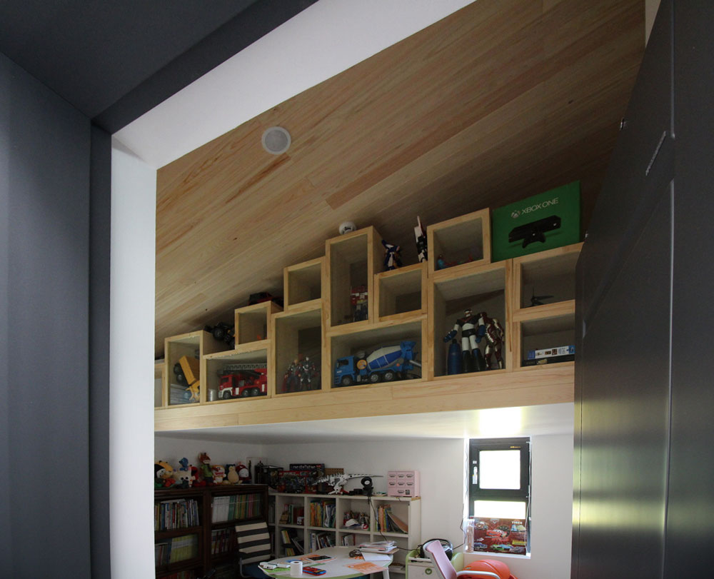 The basic floor plan consists of the old parents’(first generation) space on the 1st floor and the communal space on the second and third generations. And the 2nd floor is divided into the second and third generations’ private spaces. From the family room on the 2nd floor, (communal space) we can overlook the courtyard and the garden while sitting on the computer desk. The outside terrace on the 2nd floor is a private resting area only for the couple(second generation).
