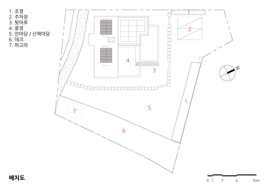 평면구성(외부) _ 대지의 형상을 고려하여 바깥마당(주차장/외부영역)과 안마당(가족공용공간)으로 구분했다. 안마당은 중정을 중심으로 툇마루(자녀공간)와 처마가 있는 테라스(노부모공간)의 사적공간과 파고라(정원시설물)와 외부데크 등의 공용공간으로 분리했다.