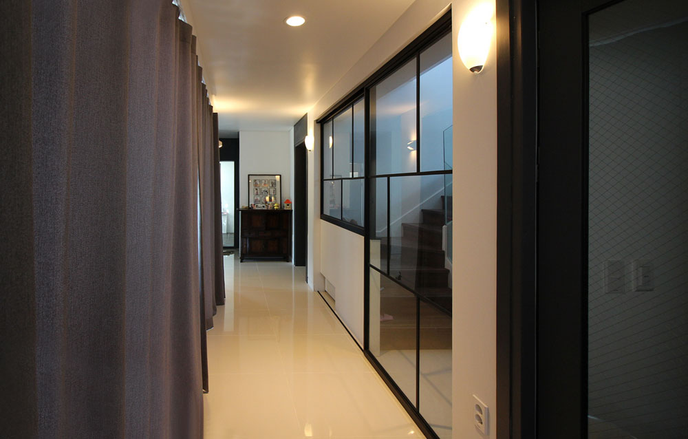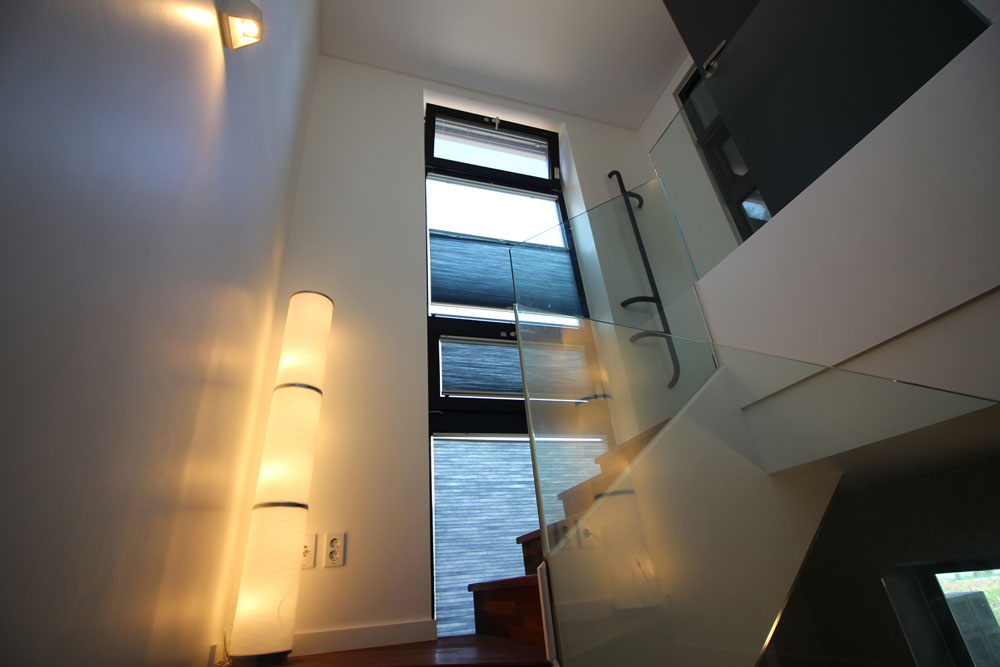 Because of the nature of the multi-storied building, the 2nd floor is relatively warmer than the first floor, so ventilation windows are installed on the top of the staircase and the family room in order to discharge warm air and create pleasant environment.