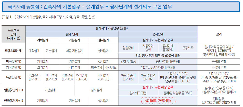 이와 같이, 건축과 공사에 있어서 오랜 전통을 가지고 업역의 범위와 역할을 정립해 온 국외사례를 보면, 국내처럼 설계자의 공사단계 참여를 막는 경우는 존재하지 않는다. 오히려, 설계자는 설계만으로 업무를 종료하지 않고, 이후에 공사준비단계에서도 건축주가 설계도서에 부합하여 시공을 잘할 수 있는 시공자를 선정할 수 있도록 적극적으로 돕고, 공사단계에서는 설계의도 구현을 위해서 시공자가 설계도서에 부합하여 시공하는지를 확인한다. (그림 1-2의 각국 공사단계 업무 참고) 건축물이 설계되어서 완공될 때까지의 포괄적인 업무가 모두 건축사의 기본업무인 것이다.