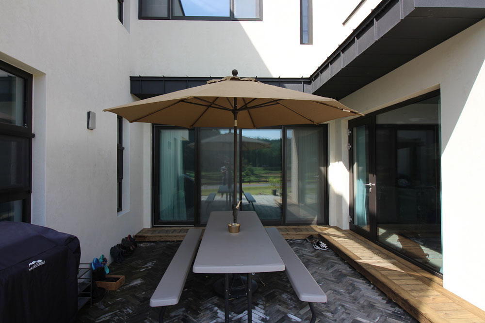 평면구성(외부) _ 대지의 형상을 고려하여 바깥마당(주차장/외부영역)과 안마당(가족공용공간)으로 구분했다. 안마당은 중정을 중심으로 툇마루(자녀공간)와 처마가 있는 테라스(노부모공간)의 사적공간과 파고라(정원시설물)와 외부데크 등의 공용공간으로 분리했다.