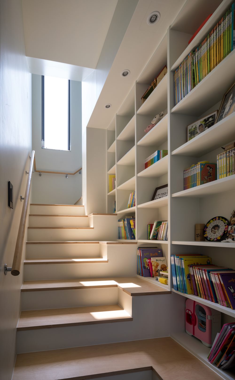 Two units were divided by it's own entrances and interior space was composed by arranging spaces at the end of corridor and stairs. Those two houses became a single house by combining with connecting path. Kitchen and dining area, and a courtyard were located at the center of moving path and livingroom were at the end of each aisle. This layout allows anyone can look and reach everywhere along the line of sight.