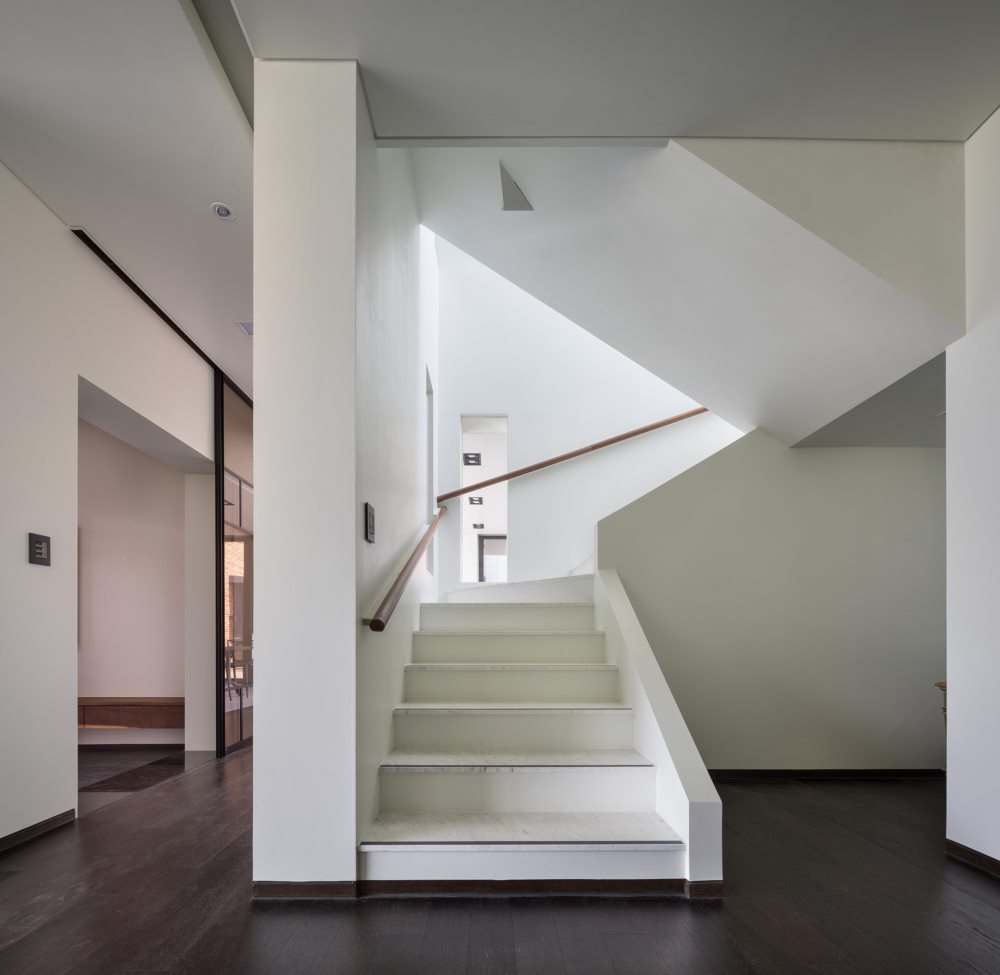 우선 남향으로 주향을 잡고, 두 세대가 공간적으로 분리되어 있지만 내부공간으로 연결되어지며 마당과 중정을 공유할 수 있도록 배치했다. 두 개의 현관을 두어 세대를 분리했으며 내부의 복도와 계단을 통한 동선의 끝에 각각의 실을 두어 공간을 완성했다. 그렇게 완성된 두 집은 하나의 연결통로를 통해 한 집이 되도록 했다.