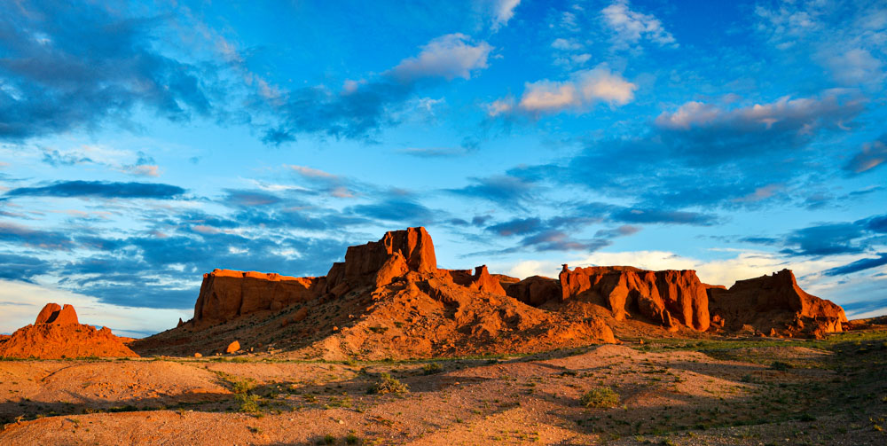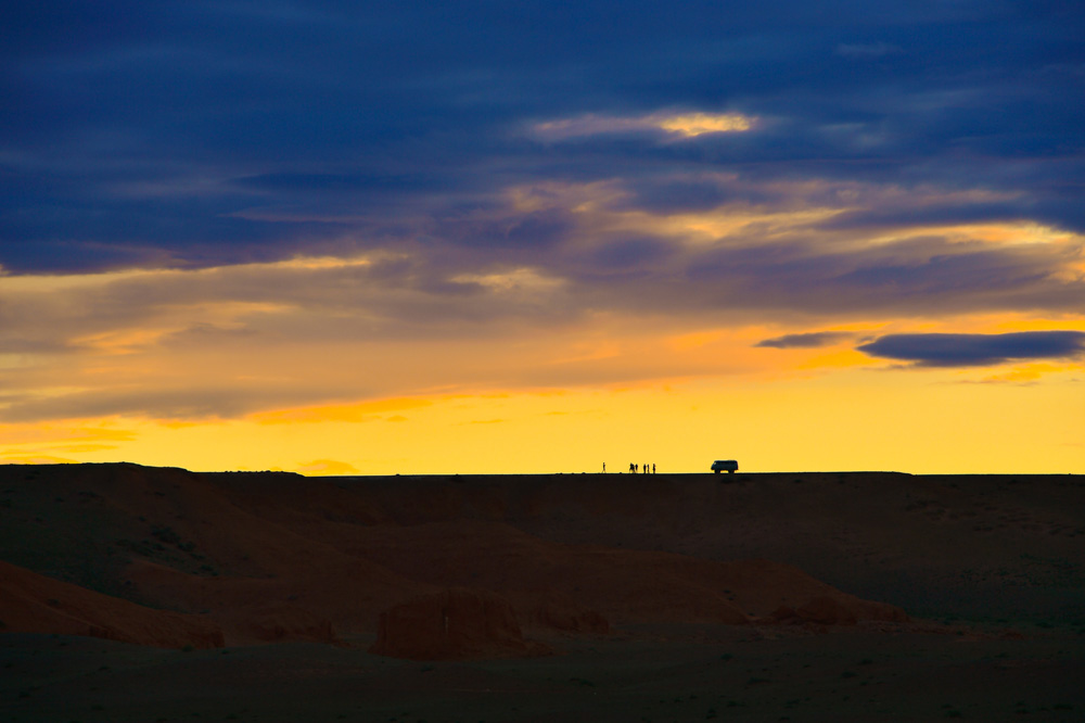 고비 사막에서 수십 킬로미터 떨어진 바양자끄란 곳은 ‘불타는 언덕’이라는 뜻을 가진 몽골의 손꼽히는 관광지다. 이곳이 유명세를 떨치는 이유는 붉은 바위산 덕택이다. 우리나라에서는 그저 바위산으로밖에 인식되지 않는 높은 바위 덩어리지만, 몽골에서는 이처럼 높은 산은 드물기에 유명하다고 한다. 필자가 이 붉은 돌덩어리 산을 열심히 촬영하는 가운데 한 대의 차량이 대평원의 석양을 배경으로 서쪽 평원에 멈춰 선다. 마치 미니어처 자동차처럼 앙증스러운데 그 가운데에도 서쪽 하늘의 석양은 천하일품이었다. 텅 빈 대평원에도 아름다움은 존재하였다. 아무것도 없는 빈 공간의 허함 속에서 그토록 아름다운 색상으로 피어난 하늘이 주는 황홀감이라니. 몽골이 아니면 느낄 수 없을 것이다.