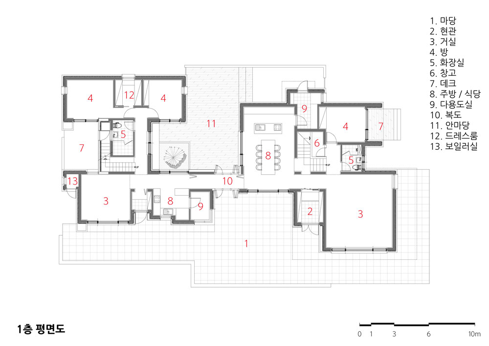 전체가 연결된 동선의 중심에 주방과 식당을 배치하고, 중정을 두었으며, 복도의 끝에 각각의 거실을 배치했다. 이러한 공간의 배치는 시선의 방향에 따라 집안 곳곳을 볼 수 있고, 어디든 갈 수 있도록 했다. 연결통로는 세대와 세대를 나누기도 하지만, 전체적인 맥락을 완성하고 앞마당과 중정을 연결하는 오브제가 된다.