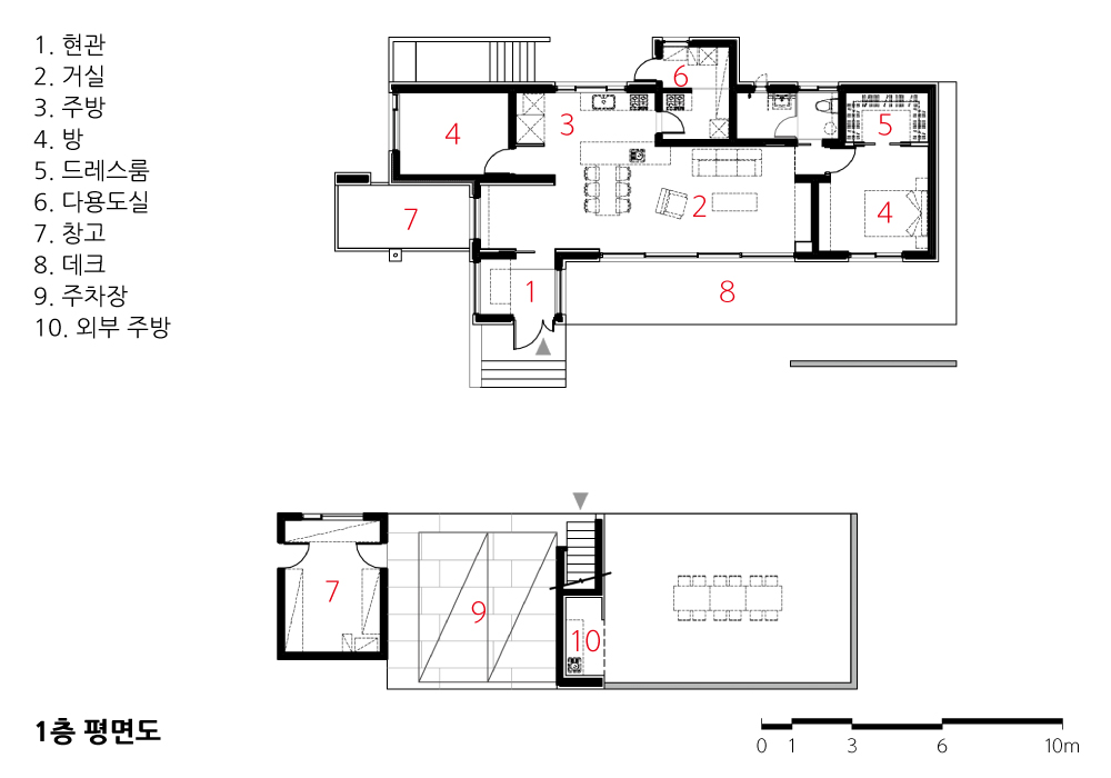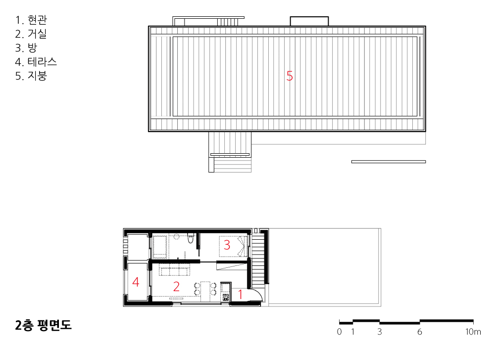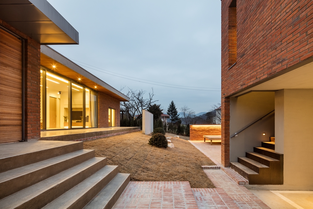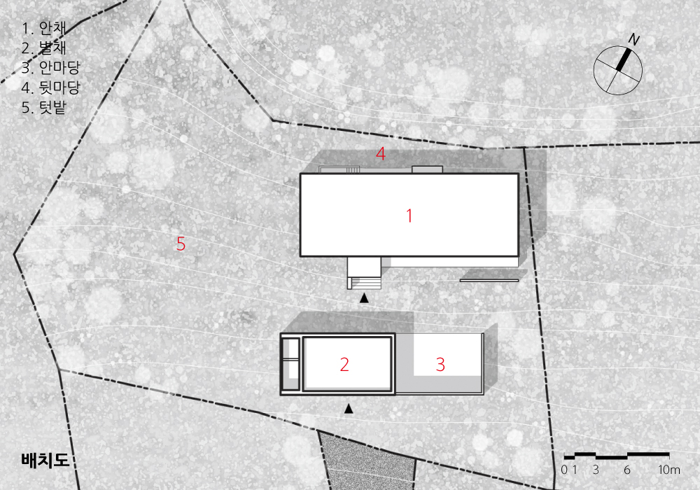결국 별채와 안채는 전면 도로로부터 앞뒤로 나란히 배치되고, 각각의 등고에 놓이면서 그 위계를 만들어간다. 그리고 그 사이에는 적당한 규모의 조경시설과 안마당이 자연스레 마련되어 자녀들 혹은 주변 이웃들과 어울릴 수 있는 외부 활동공간으로 이용된다.