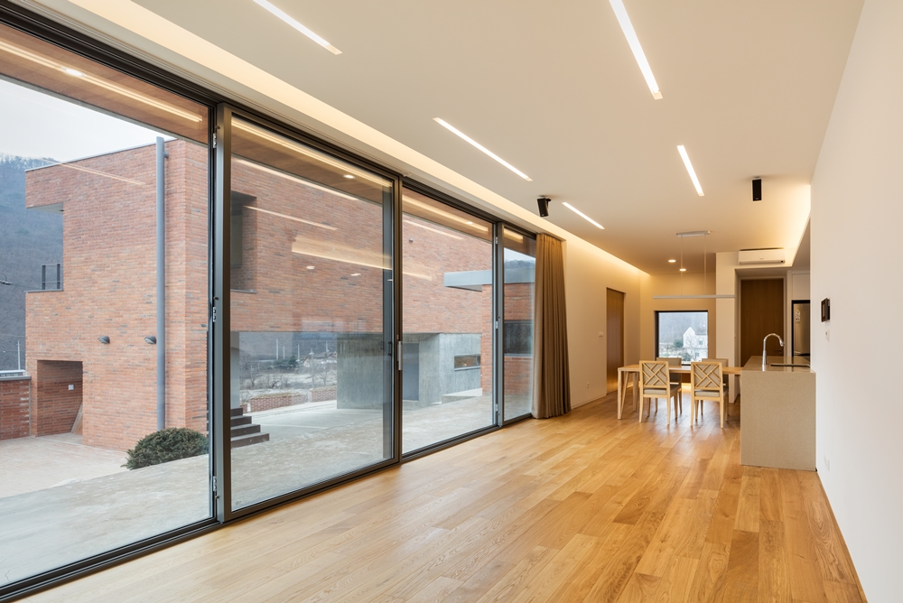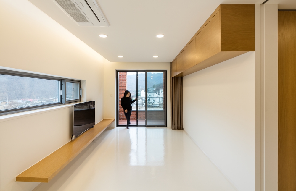 At the sloped entrance is a detached house where their children can stay, and the elderly couple's residence sits inside the site, through the piloti at the bottom of the detached one. The piloti of the detached house is also a parking lot with a roof. It protects vehicles from heavy snowfall in Gangwon-do while serving as a shelter to protect the elderly couple's residence from external interference. Also, at the request of the old couple who insist on feng shui (geomantic principles), we designed to naturally cover the direct view of the Sshoibbulbong Peak spreading farther south from their residence.