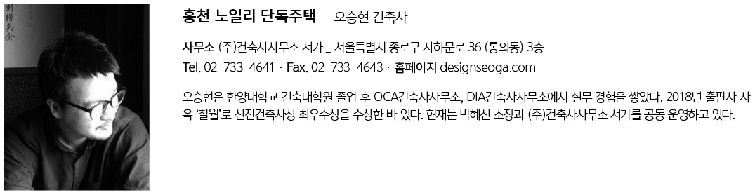 | 홍천 노일리 단독주택 설계자 | 오승현 · 박혜선 _ (주)건축사사무소 서가 감리자 | 오승현 · 박혜선 _ (주)건축사사무소 서가 시공사 | 아르텍 설계팀 | 박혜선, 최태수 대지위치 | 강원도 홍천군 북방면 노일로 주요용도 | 단독주택 대지면적 | 997.00㎡ 건축면적 | 174.97㎡ 연면적 | 170.62㎡ 건폐율 | 17.54% 용적률 | 17.11% 규모 | 지상 2층 구조 | 철근콘크리트조 외부마감재 | 고벽돌 내부마감재 | 석고보드 위 수성페인트 도장 설계기간 | 2014. 05 ~ 2014. 10 공사기간 | 2014. 10 ~ 2015. 04 사진 | 신경섭 전문기술협력 - 구조분야 : 터구조 - 기계설비분야 : 청림설비 - 전기분야 : 비전ENG - 토목분야 : 제일측량설계사무소 |