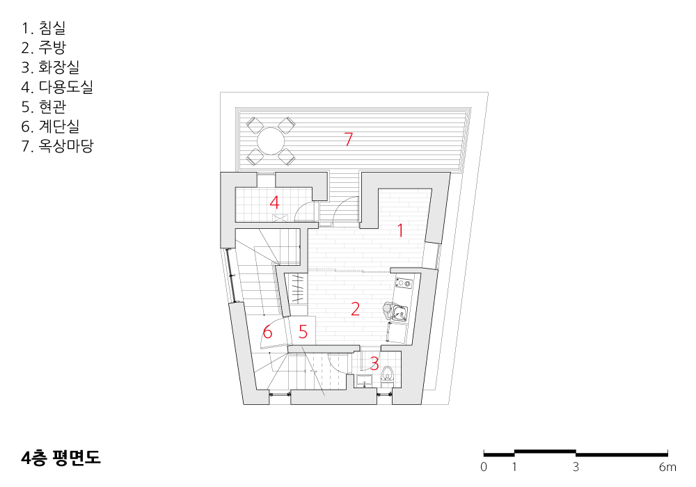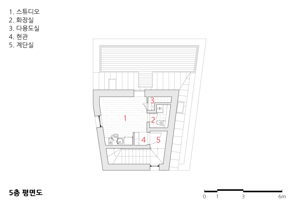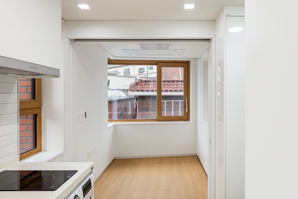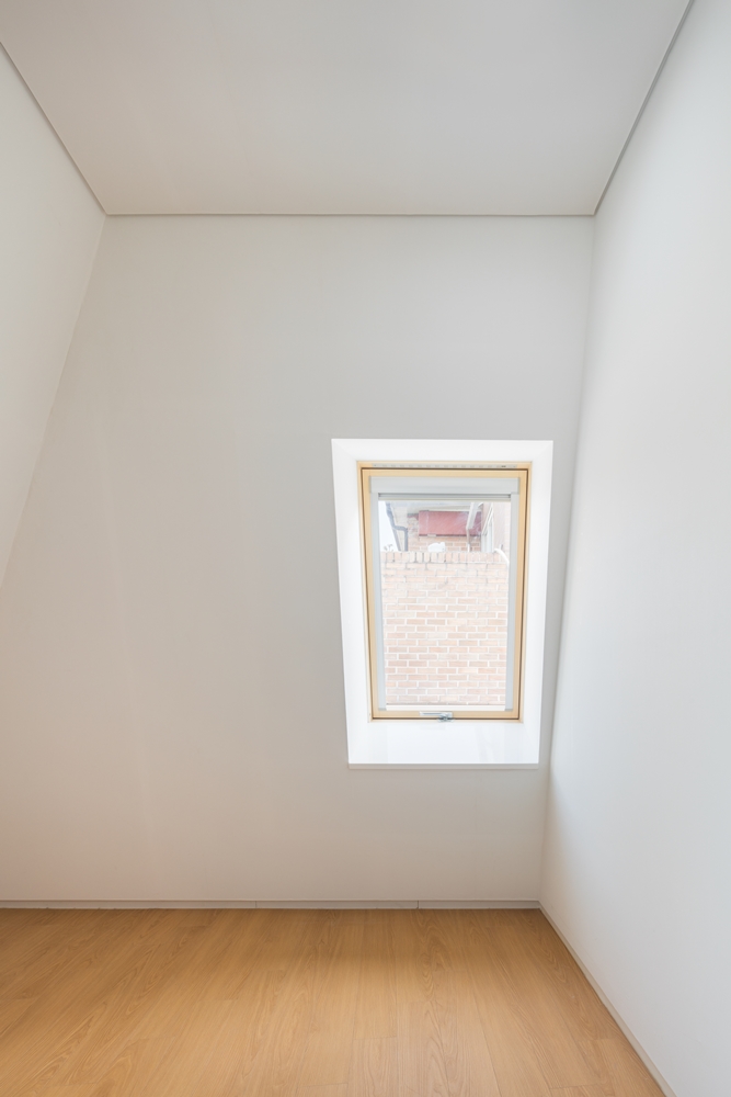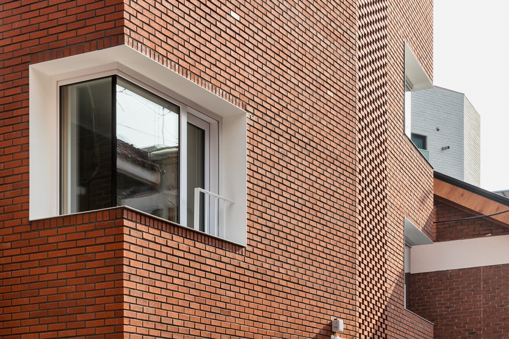 The common staircase was designed with rough exposed concrete walls and stone burner floor finishing, avoiding embellishment as much as possible and revealing the texture of the material itself. By adding a layer through masonry work to the curtain wall of the staircase, it is advantageous for light and ventilation while blocking another’s eyes from outside. The flat composition of households consist of a household compositions with unique characteristics such as one-room house, two-room house, house with an outside yard and house with a high ceiling, reflecting tastes of various female residents.