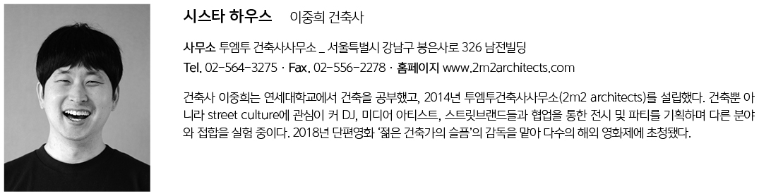 시스타 하우스 설계자 | 이중희 _ 투엠투 건축사사무소 건축주 | 김한결 감리자 | 이중희 _ 투엠투 건축사사무소 시공사 | 이립건설주식회사 대지위치 | 서울특별시 마포구 대흥로9길 30 주요용도 | 다세대주택 / 근린생활시설 대지면적 | 131.54㎡ 건축면적 | 66.97㎡ 연면적 | 206.32㎡ 건폐율 | 50.91% 용적률 | 156.84% 규모 | 지상 5층 구조 | 철근콘크리트조 외부마감재 | 점토벽돌, 컬러강판, 노출콘크리트 내부마감재 | 벽지, 노출콘크리트 설계기간 | 2018. 10 ~ 2019. 02 공사기간 | 2019. 04 ~ 2020. 01 사진 | 신경섭 전문기술협력 - 구조분야 : SDM - 기계설비분야 : (주)대광엔지니어링 - 전기분야 : (주)대광엔지니어링 - 소방분야 : (주)대광엔지니어링 |
