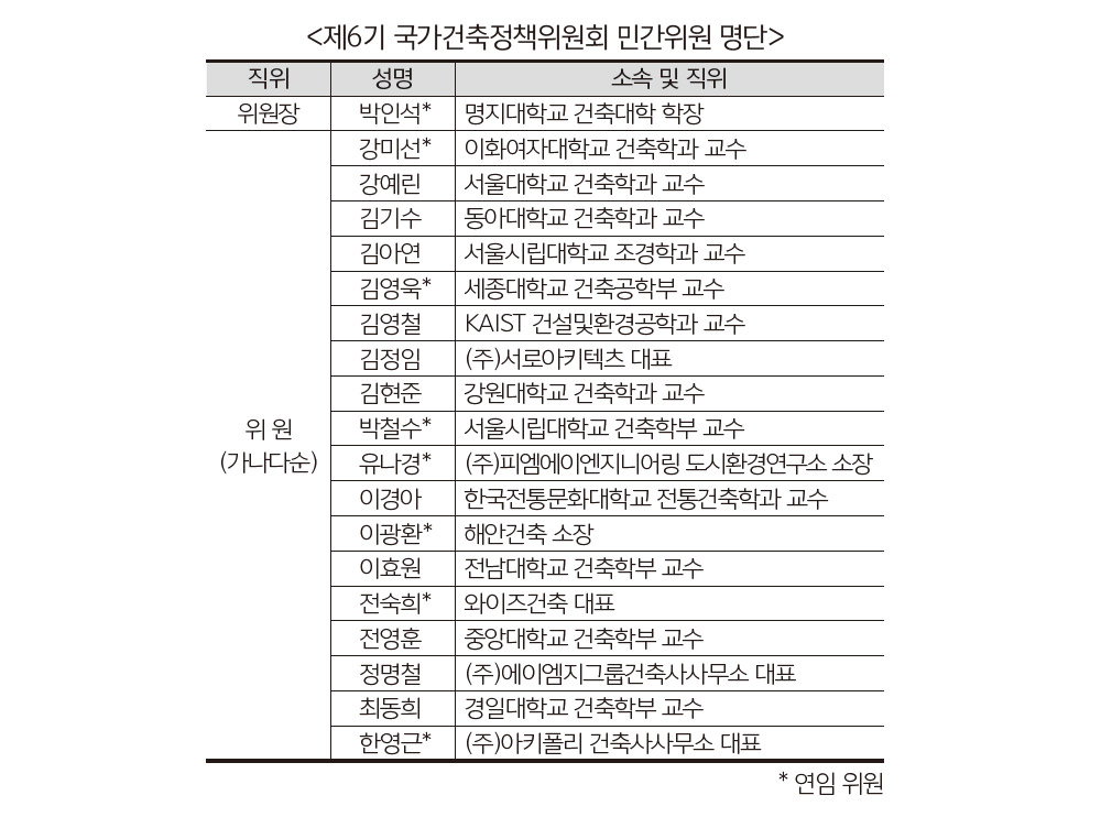 국토교통부는 국가건축과 도시정책을 총괄하는 제6기 국건위가 19일 출범한다고 5월 18일 밝혔다. 국건위는 ‘건축기본법’에 따라 설립되는 대통령 소속 위원회로서, 총 30명(위원장 포함 민간 위원 19명과 당연직 위원 11명)으로 구성되고, 국가 건축정책의 비전과 목표를 제시하며 관계부처 건축정책의 심의와 조정 역할을 한다. 이번 6기 국건위 위원장에는 박인석 명지대학교 건축대학 교수가 지명됐다. 박인석 위원장은 도시·건축분야 전문가로 우리 도시건축의 발전을 위한 정책 연구와 저술 등의 활동을 해왔으며, 제5기 위원회에서 정책조정분과 위원장으로 활동했다. 이번에 새롭게 위촉된 6기 민간위원의 특징을 살펴보면 제5기 국건위가 추진했던 건축 허가제도 개선, 발주방식 개선, 도시설계 혁신과 도시건축 통합설계 확산, 생활SOC 혁신 등의 정책적 연속성을 이어나갈 수 있도록 전체 19명 중 8명의 위원이 연임됐고, 지역균형발전과 양성평등 기조에 발맞추기 위해 비수도권 전문가 7명, 여성위원 8명, 젊은 인사 8명이 각각 위촉됐다. 6기 국건위 민간위원으로는 박인석 위원장을 비롯 대한건축사협회 이사인 정명철 (주)에이엠지그룹건축사사무소 대표와 강미선(이화여대 건축학과 교수), 강예린(서울대학교 건축학과 교수) 등 교수와 이광환(건축사, 해안건축), 전숙희(와이즈건축) 건축사 등 19명이 위촉됐고, 당연직 위원에는 기획재정부와 국토교통부 장관 등 11명의 중앙부처 장관으로 구성된다.