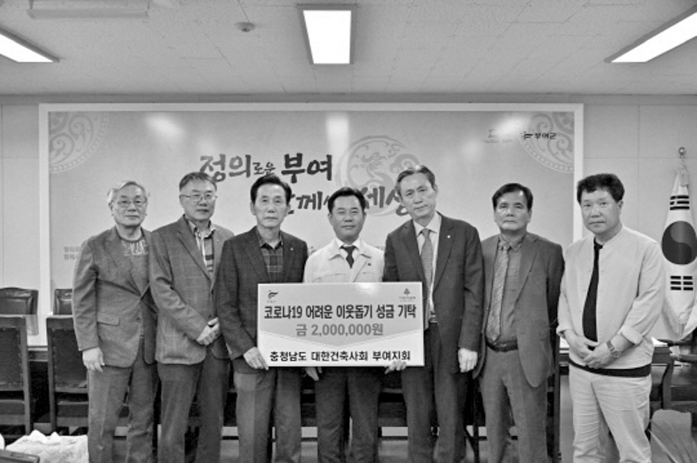 충청남도 부여지역건축사회는 5월 7일 코로나19 극복과 어려운 이웃 지원을 위한 성금 200만 원을 부여군에 기탁했다. 이기오 부여지역건축사회장은 “코로나19로 군수님을 비롯한 군청, 보건소 공직자들의 노고가 많다. 아직 종결된 것이 아닌 만큼 더 수고해주시길 부탁한다”고 전했다.