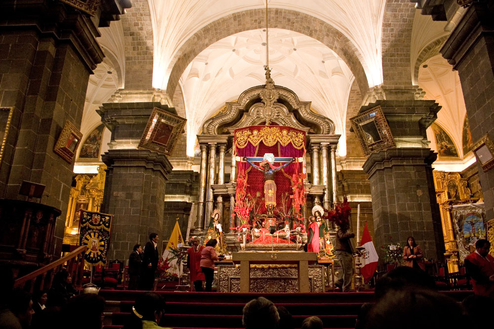쿠스코 대성당에서 들어서면 유독 눈길을 끄는 것은 지진의 신이라는 검은 예수상이다. 천정에서 내려오는 붉은 천을 배경으로 십자가에 매달린 검은 예수상을 가운데 두고 왼쪽 아래에는 성모 마리아 상과 오른쪽 아래에는 산티아고 상이 나란하게 있다.