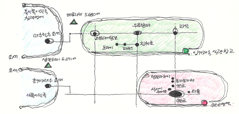 제국의 심장인 쿠스코는 왕궁과 신전을 중심에 두고 네 부족의 귀족 주거지가 둘러싼 도시 영역이 퓨마 모양으로 배치되어 있고, 곡창 지대는 강줄기를 따라 피삭, 친체로, 모라이, 오얀타이탐보로 이어져 있다. 서쪽으로 밀림이 시작되는 경계선에 마추픽추와 초케키라우 요새가 제국을 안전하게 지켜주었다.