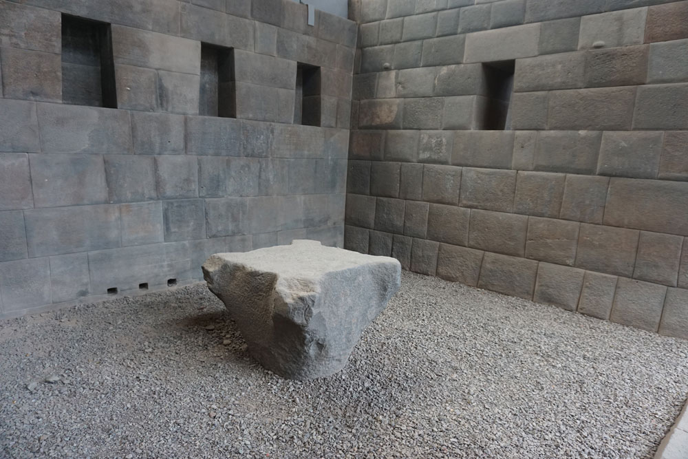 희생 제물을 바쳤다고 추정되는, 퓨마 가죽을 펼쳐놓은 모양의 사각형의 평평한 돌은 잉카의 네 부족을 상징한다. 태양신에게 의식을 올리던 곳으로 보이는 이 방의 벽체는 전체적으로 사다리꼴이다. 네 개의 사다리꼴 벽감(벽면을 우묵하게 해서 만든 공간으로 일반적으로 조각상이 놓여지나 장식용으로 만들어지기도 한다)이 설치돼 있고 남서향 벽에는 빛이 들어오는 일련의 창이 카메라 렌즈처럼 열려 있다. 믿기 어려울 정도로 완벽한 마감이다. 마치 기계로 갈아낸 듯하다.