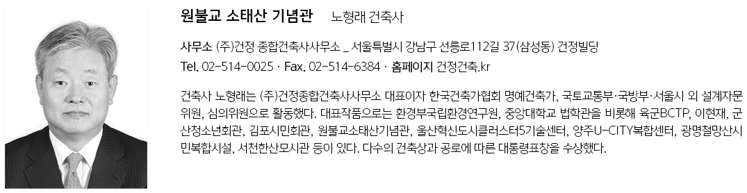 | 원불교 소태산 기념관 설계자 | 노형래_(주)건정 종합건축사사무소 건축주 | (재)원불교 감리자 | (주)전인CM 시공사 | 요진건설산업 설계팀 | 고종준, 김원중, 이종규 대지위치 | 서울특별시 동작구 현충로 75 주요용도 | 종교시설 대지면적 | 5,826.00㎡ 건축면적 | 3,050.04㎡ 연면적 | 26,300.75㎡ 건폐율 | 52.35% 용적률 | 202.79% 규모 | 지하 4층, 지상 10층 구조 | 철근콘크리트조, 철골철근콘크리트조 외부마감재 | 테라코타패널, 테라코타루버, 금속패널, 로이복층유리 내부마감재 | 친환경수성페인트, 타일, 흡음텍스 등 설계기간 | 2015. 6 ~ 2017. 4 공사기간 | 2017. 5 ~ 2019. 9 사진 | 채수옥 전문기술협력 - 구조분야 : (주)한울구조안전기술사사무소 - 기계설비분야 : (주)한국전기설계감리기술단 - 전기분야 : 세종종합기술(주) - 소방분야 : (주)한석소방이엔씨 |