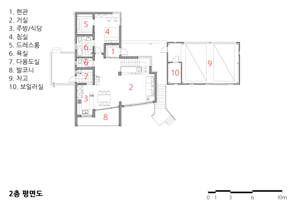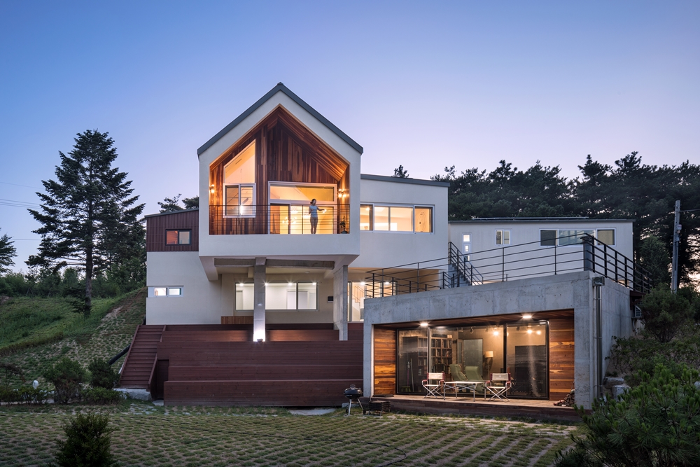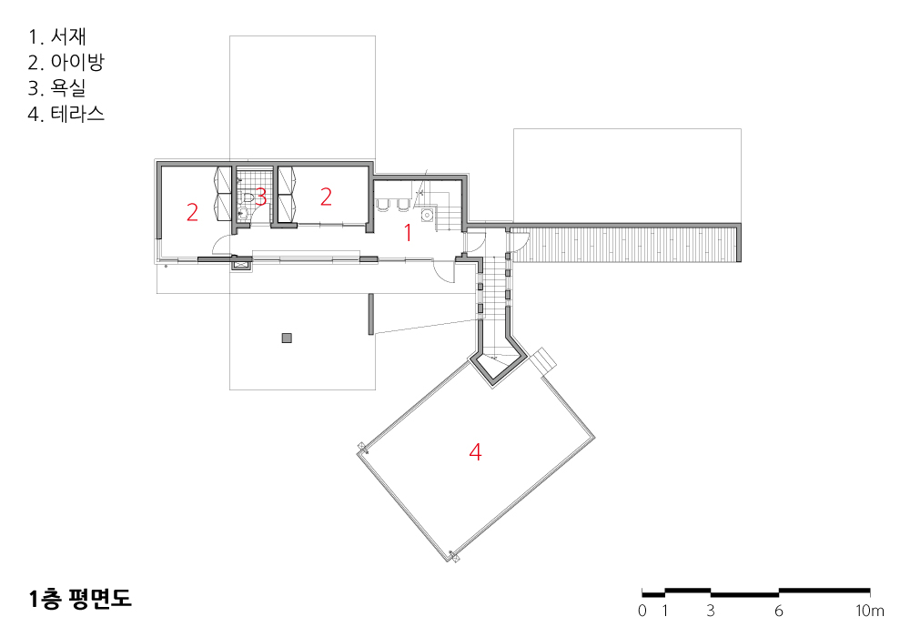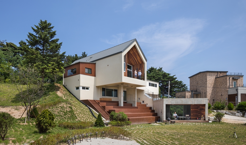 초기 계획은 3세대를 위해 부부, 아이들, 부모님의 공간을 3개 층에서 연결하여 세대 간 어우러짐을 보여주려고 했다. 그러나 부모님의 공간을 배제하게 되면서 3개 축 매스는 2개 축으로 되었다. 지형을 따라 흘러내리는 3개의 분절된 매스가 중간층에서 횡으로 상부구조를 받치는 형태다. 거실 부분이 돌출돼 하나의 기둥으로 전체 구조를 받치고 떠 있는 듯한 느낌이다. 지하 층 매스는 지형을 왼손으로 잡아서 붙잡아 주는 듯한 느낌을 주고자 하였다.