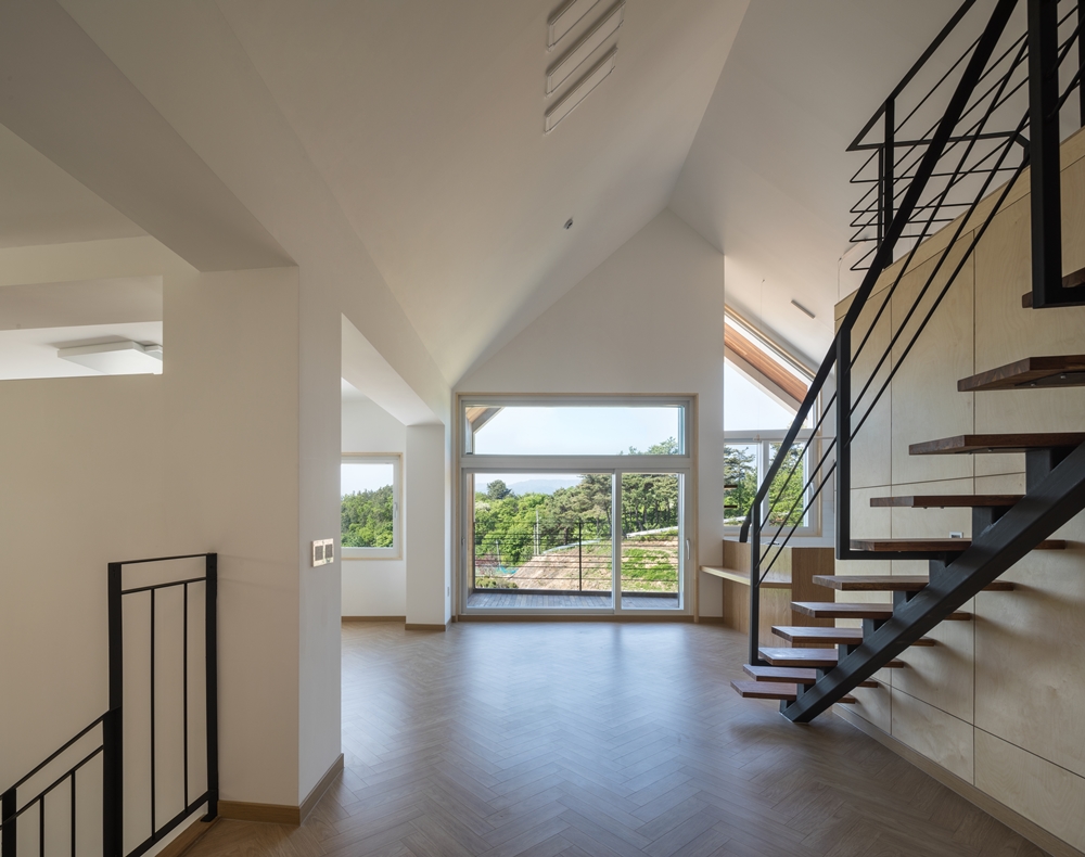 For Pangyo-ri House, we particularly focused on how to organize outward views. The windows at the living room have another axis that deviates separately from the axis of the building a bit towards the eastern direction, in order to provide the better view towards the outside scenery while letting the direction of the building flow along the topography. Going up to the loft between the vestibule and the kitchen, one can view the remote hills to the south through the high windows at the kitchen. For the stair hall, the couple's room, and the children's room, three corner windows were designed for outward views.