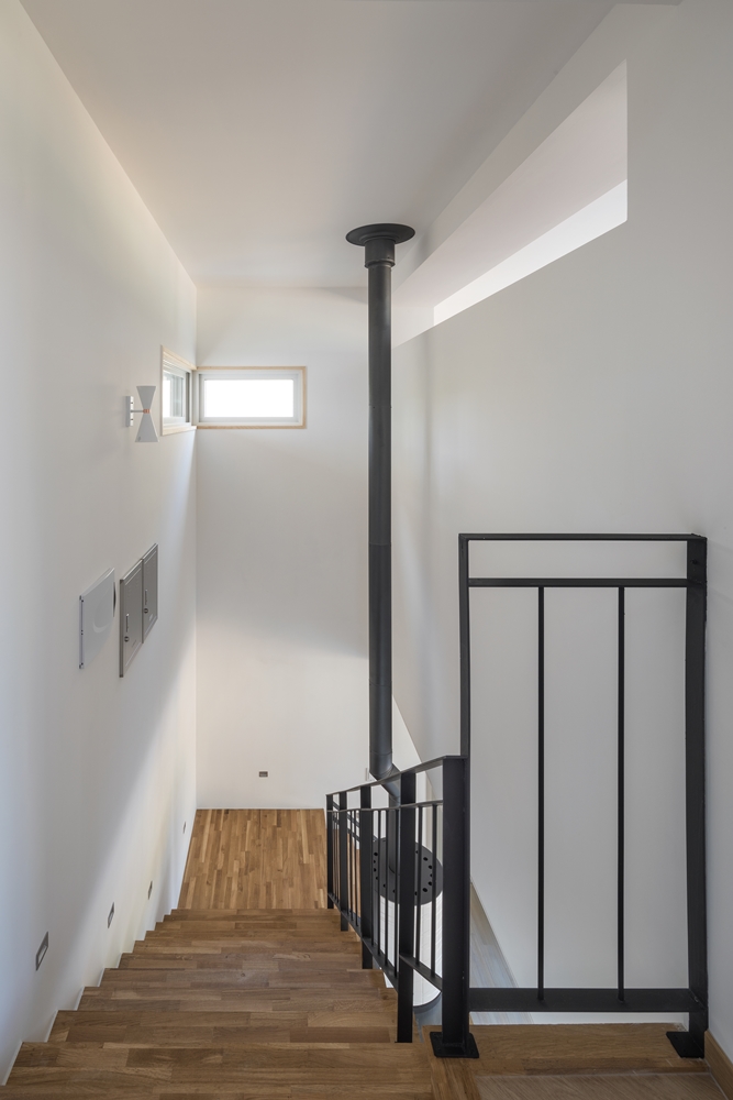 가장 높은 부분에는 거실 및 주방, 부부의 공간을 마련했다. 중간 부분은 두 아이의 침실 및 공부 공간, 가장 낮은 층은 가족들의 취미생활을 할 수 있는 공간으로 배치했다. 내부 통로는 거실에서 계단으로 연결된다. 현관과 주차장 사이에도 1층의 지붕 테라스로 가는 외부 계단을 마련했다.