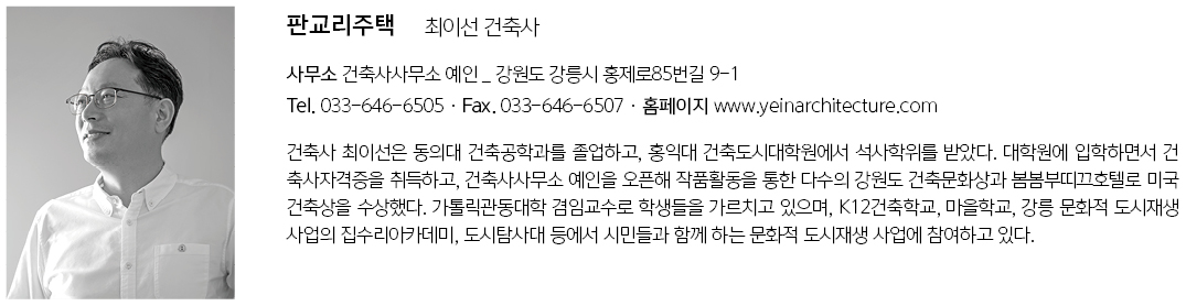 | 판교리 주택 설계자 | 최이선 _건축사사무소 예인 건축주 | 신형직 감리자 | 장재익 _ 한성 건축사사무소 시공사 | 건축주 직영 설계팀 | 이명선, 김정미 대지위치 | 강원도 강릉시 사천면 조부동길 263-5 주요용도 | 단독주택 대지면적 | 850.00㎡ 건축면적 | 256.24㎡ 연면적 | 282.65㎡ 건폐율 | 30.15% 용적률 | 28.39% 규모 | 지하 1층, 지상 2층 구조 | 철근콘크리트조 외부마감재 | 스터코, 징크 내부마감재 | 강화마루, 하드우드, 친환경 수성페인트 설계기간 | 2014. 10 ~ 2015. 02 공사기간 | 2016. 03 ~ 2018. 04 사진 | 윤준환 전문기술협력 - 구조분야 : 나라구조엔지니어링 - 기계설비분야 : 대현설계감리사무소 - 전기분야 : 대현설계감리사무소 - 소방분야 : 대현설계감리사무소 |