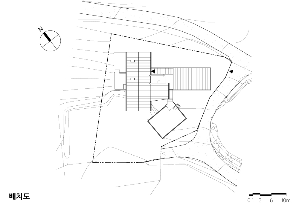 기존의 오래된 주택은 능선 아래 풍수 좋은 곳에 위치해 있었다. 후면부로는 주택의 바람을 막아주는 언덕이 2개 층 정도의 높이로 주택을 감싸고 있었다. 상부 언덕에서는 바람과 소음에 노출되어 있지만 원경의 아름다움을 조망할 수 있었다. 하단에 있는 기존 주택 부지에선 전경을 볼 순 없지만 기후로부터 보호받을 수 있었다. 이러한 장점을 모두 취할 수 있도록 대지를 따라 흐르는 3개 층 집을 계획하게 되었다.
