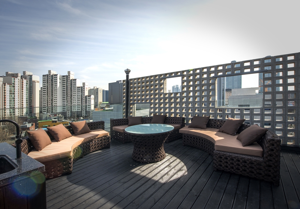상가주택을 지으려는 건축주들 대부분은 실내 바닥 면적을 최대로 만들고자 한다. 사업성을 고려한 건물에서 임대 면적이 곧 돈이라는 생각은 틀린 말이 아니다. 하지만 건축사의 생각이 조금 다른 경우도 있다. 실내 면적과는 상관 없는 특별한 공간이 공간의 가치를 올리는데 기여할 수도 있다는 생각이 그것이다. 우리는 임대 공간에 발코니 같은 외부 공간을 만든 뒤 그 곳에 식재를 두도록 했다. 한 평 남짓한 발코니는 비록 시멘트 블록 스킨에 가려 잘 보이진 않지만, 그 층에서 유일하게 외부와 연결되는 공간이고 동시에 건물 전체에서 꽤 큰 디자인 요소다. 외부 스킨에 슬며시 투영되도록 해 좁고 긴 건축물에 약간의 깊이감이 느껴지도록 했다. 그 곳에 놓인 화분의 식재는 자칫 삭막해 보일 수 있는 입면에 생동감을 부여한다. 실제로 최대 임대 면적이 아닌 이 공간은 최대 임대 면적으로 지어진 주변의 다른 건물보다 높은 임대수익을 올리고 있다.