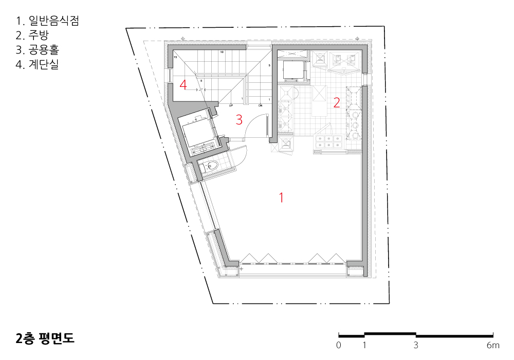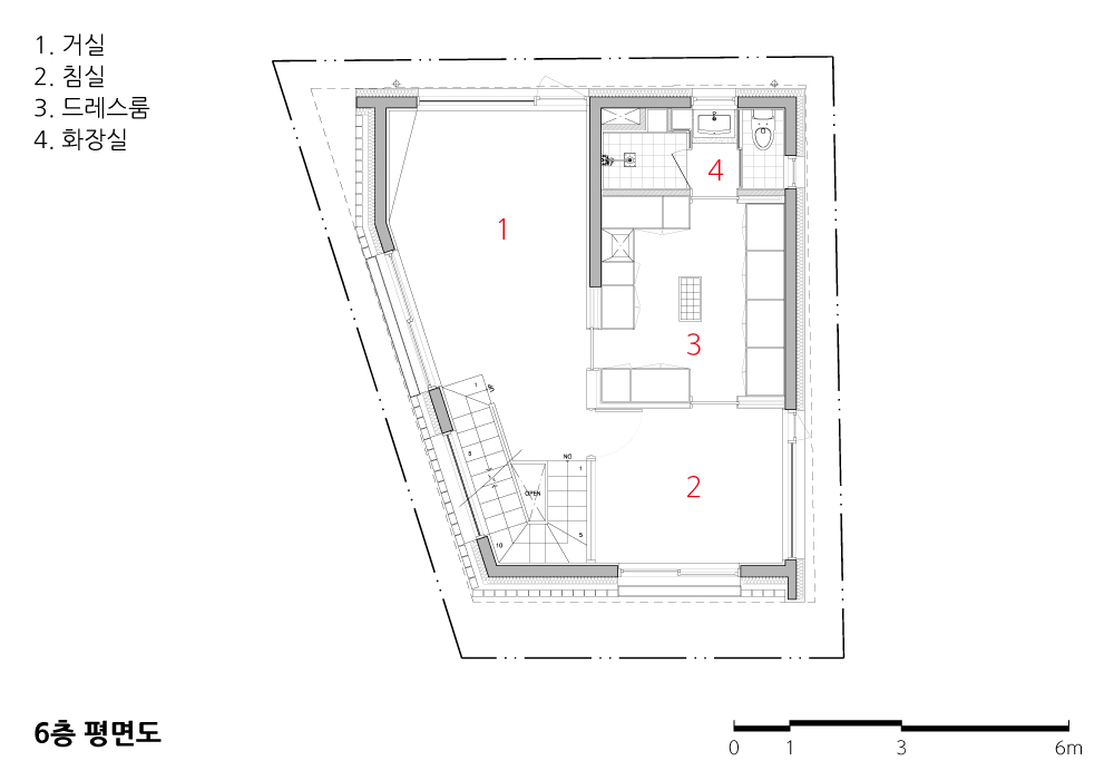면적이 작은 땅 위에 건축을 하기란 여간 쉬운 일이 아니다. 구조나 설비 문제가 아니라 건축주의 꿈을 담아내기에 허용되는 면적이 너무 작기 때문이다. 협소 건축은 상대적으로 부족한 체적 범위에서 설계를 해야 하므로 다양한 아이디어가 필요하다. 설계하는 치수 하나하나가 전체 건물에 큰 영향을 미친다. 96제곱미터의 대지 위에 올린 이 건축물의 한 개 층 최대 면적은 57.6제곱미터정도인데, 코어 공간(계단실, 엘리베이터)을 제외하면 39.7제곱미터 내외다. 결국 코어 공간의 형태에 따라 전체 건축물이 달라지게 되는 셈이다. 건축주와의 합의를 거쳐 콤팩트하면서 기능이 좋은 코어 형태를 찾는 데 많은 시간을 보냈다.