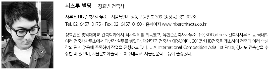 | 시스루 빌딩 설계자 | 정효빈 _ HB건축사사무소 건축주 | 이상진 감리자 | 그리드에이 건축사사무소 시공사 | 건축주 직영 설계팀 | 백경욱 대지위치 | 서울특별시 성동구 왕십리로16가길 22 주요용도 | 단독주택 + 근린생활시설 대지면적 | 96.00㎡ 건축면적 | 55.37㎡ 연면적 | 299.22㎡ 건폐율 | 58.72% 용적률 | 311.69% 규모 | 지상 6층 구조 | 철근콘크리트조 외부마감재 | 시멘트 블록(두라스택), STOCO 내부마감재 | 친환경페인트 설계기간 | 2016. 05 ~ 2016. 12 공사기간 | 2017. 02 ~ 2017. 10 사진 | 정우철, 이준열 전문기술협력 - 구조분야 : 김앤이 구조설계사무소 - 기계설비분야 : 지엠엔지니어링 - 전기분야 : 지엠엔지니어링 - 소방분야 : 지엠엔지니어링 |