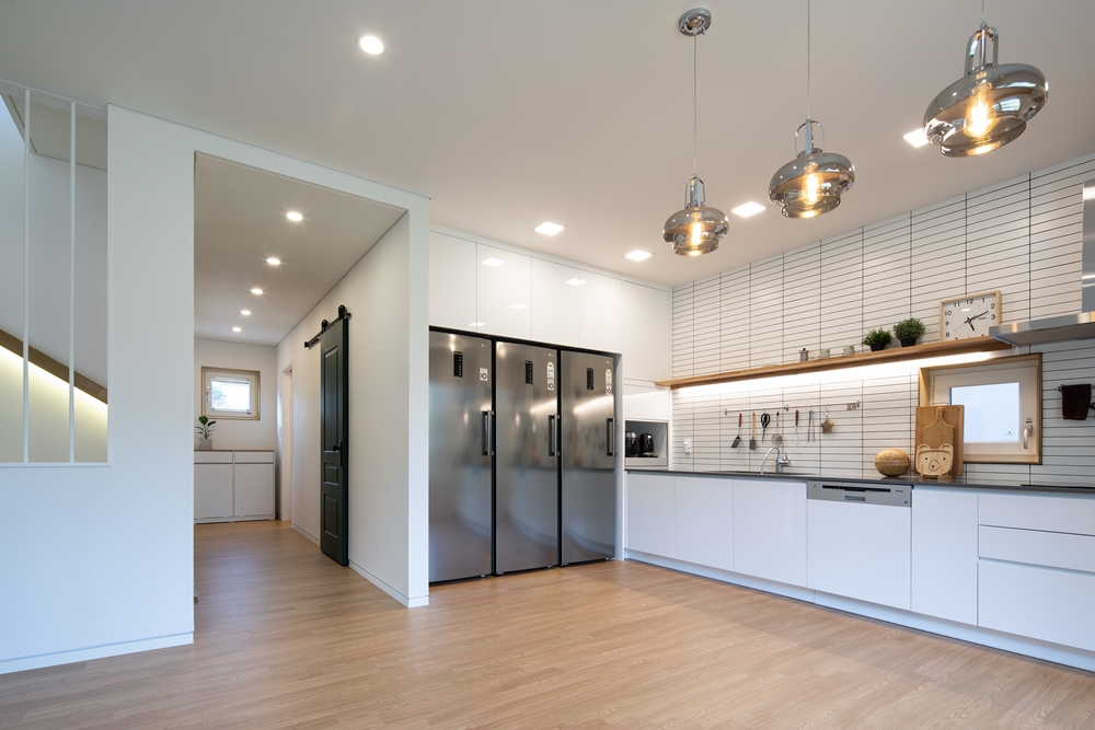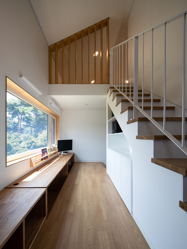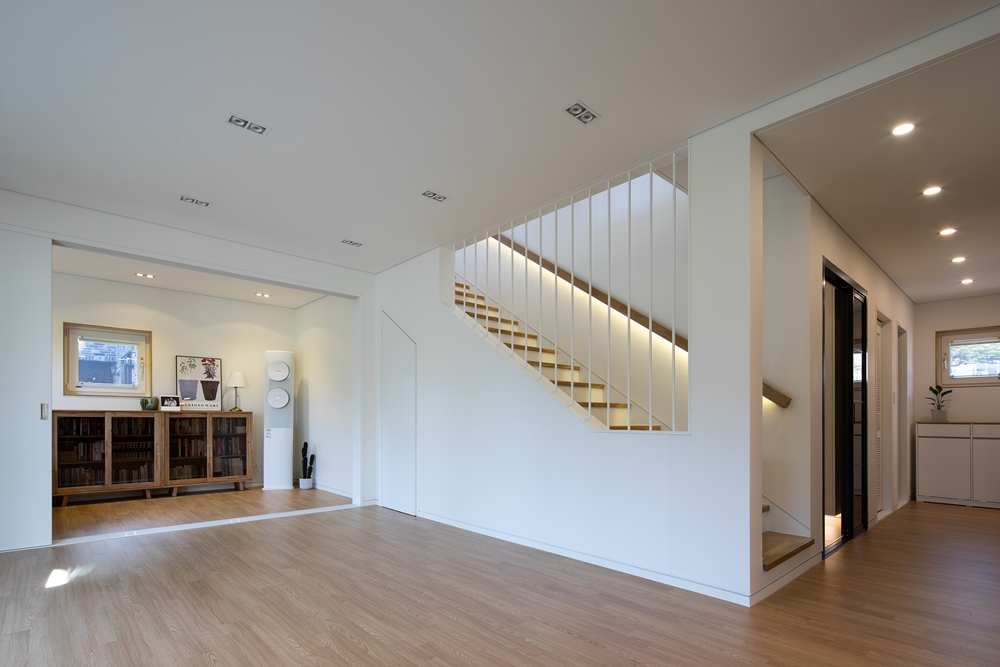 To overcome the size of the house, we made space changes everywhere to give a sense of rhythm. And to create bright and warm emotions, we designed it with important consideration of light and family communication. To build a house where they have fun while living rather than a house to show, we tried to include various spatial elements in a simple exterior.