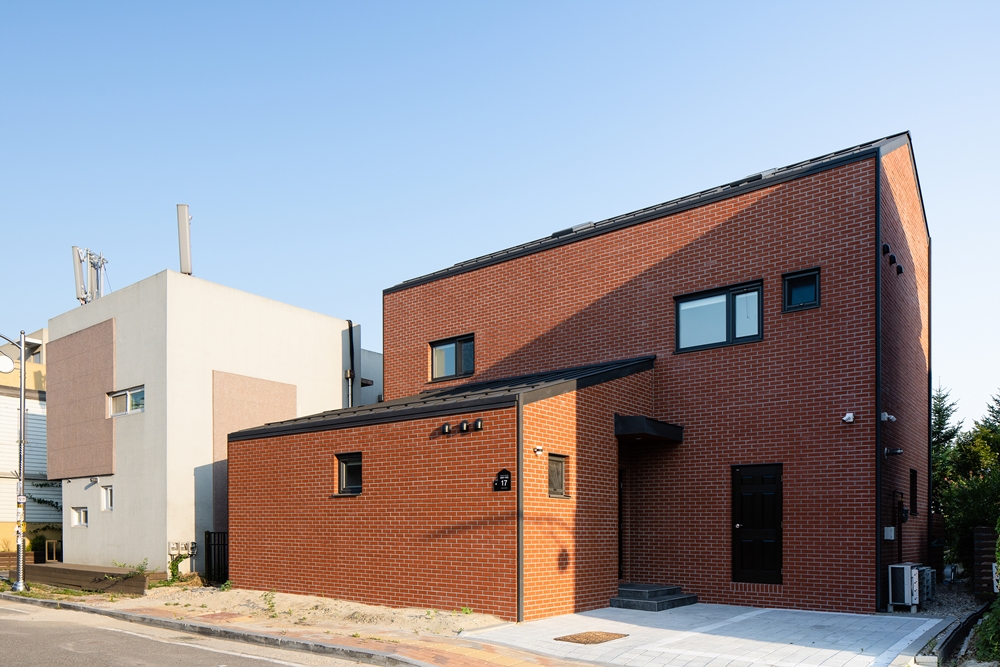 ‘Lee-u House’ is a small house in Osan for Lee’s family and Yoo’s family. The south is open to buffered green belt, and the north has a backyard, providing unobstructed land conditions. The project began with a goal of building a red brick house where their two sons can freely play. For the goal, we began with securing as much yard as possible in terms of the layout. After the basic form was organized, the roadside was set back to the southward to give a sense of rhythm, and a functional mass was added to transform it.