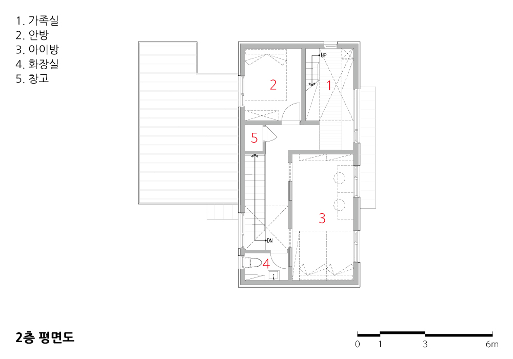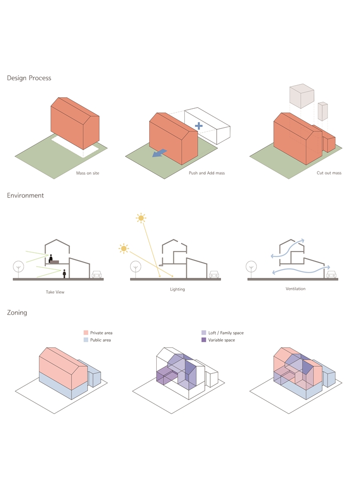 집의 크기를 극복하기 위해 곳곳에 공간 변화를 심어 리듬감을 주었다. 밝고 따듯한 정서를 만들기 위해 빛과 가족 간 소통을 중요하게 고려하여 계획했다. 보여주기 위한 집보다는 살면서 즐거움을 느끼는 집을 짓기 위해 단순한 외관에 다양한 공간적 요소를 담고자 했다.