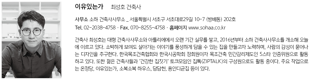 | 이유있는가 설계자 | 최성호_소하 건축사사무소 건축주 | 유문영, 이승표 감리자 | 정광현 _ 메타 건축사사무소 시공사 | HNH건설 대지위치 | 경기도 오산시 금암로11번길 17 (금암동) 주요용도 | 단독주택 대지면적 | 238.00㎡ 건축면적 | 82.19㎡ 연면적 | 136.56㎡ 건폐율 | 34.53% 용적률 | 57.38% 규모 | 지상 2층 구조 | 경량목구조 외부마감재 | 이화B&C 명가천연토석 P_3000 내부마감재 | 합지, 벽돌타일 설계기간 | 2017. 08 ~ 2018. 01 공사기간 | 2018. 02 ~ 2018. 06 사진 | 이한울 _ 나르실리온 전문기술협력 - 구조분야 : (주)위너스BDG - 기계설비분야 : (주)태영E.M.C - 전기분야 : (주)태영E.M.C - 소방분야 : (주)태영E.M.C |