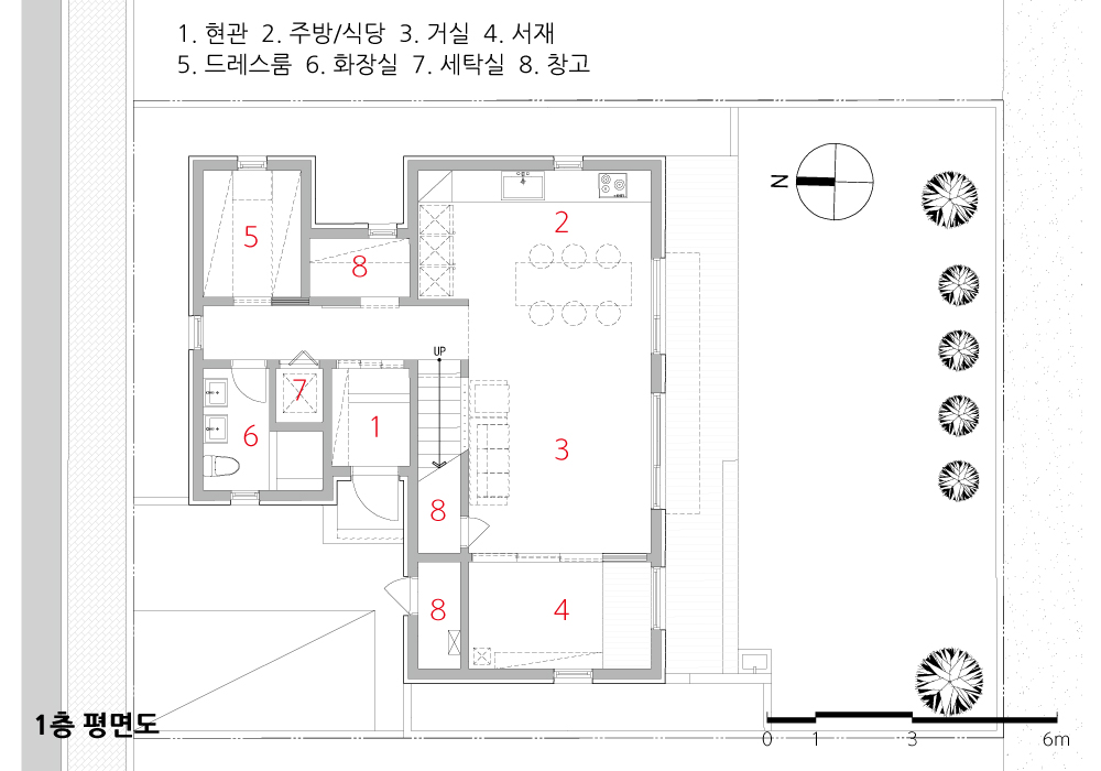 1층은 열린 공용 공간(남쪽 마당)과 기능적인 공간(북쪽)으로 구성돼 있다. 2층에는 아이 방·다락으로 연결된 가족실(남쪽)과 안방·서비스 공간(북쪽)이 있다. 집의 핵심 공간은 긴 테이블이 있는 식당이다. 가족들이 테이블에 앉아서 밥도 먹고, 책도 읽고, 대화도 하며 집에서 즐거움을 느끼는 공간이다.