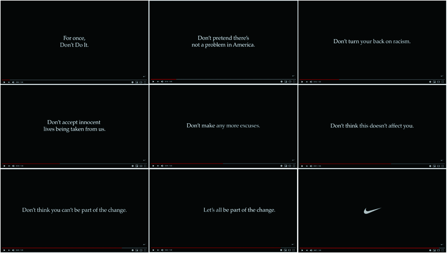 5월 25일 미국 미네소타주에서 백인 경찰관의 가혹행위로 흑인 남성이 사망한 ‘조지 플로이드 사건’을 계기로 미국에서 시위가 확산하고 있는 가운데 나이키는 30년 동안 유지해온 슬로건 ‘Just Do It’(그냥 해라) 대신 'Don't Do It'(하지 마라)이라는 슬로건의 광고를 내보냈다. 나이키가 무엇을 하지 말라는 메시지를 띄운 건 30년 만에 처음이다. 나이키는 이 광고에서 ‘딱 한 번만 하지 말라’고, ‘미국에 문제가 없는 척하지’ 말고 ‘인종차별주의에 등 돌리지 말라’고 촉구했다.