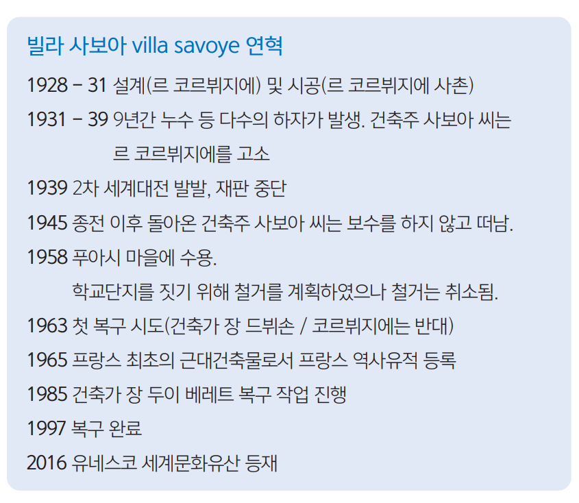 모더니즘 건축의 영광과 모순을 모두 갖춘 빌라 사보아는 방치되어 철거 위기까지 갔다가 재축으로 부활했다. 지금은 본래의 모습을 되찾고 세계문화유산 등재라는 명예까지 갖게 되었다. 말도 많고 탈도 많았던 빌라 사보아가 지금의 모습 그대로 불멸하기를 바란다.