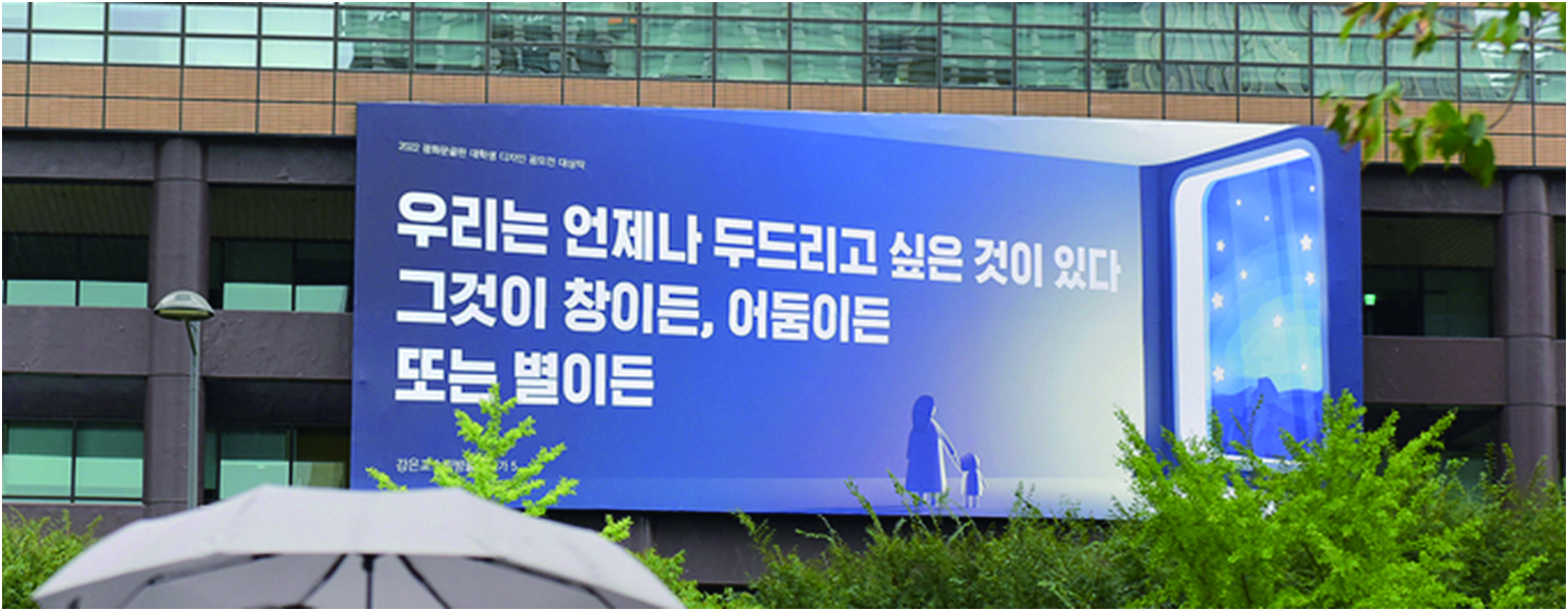 2022년 가을에 새로 걸린 광화문글판의 내용이다. 광화문글판은 교보생명 사옥에 부착되어 있는 시민을 위한 글판이다. 1991년부터 시작됐으니 30년 넘게 계속되고 있다. 광화문글판은 ‘인생 한 문장’이라는 슬로건으로 1년에 서너 번 바뀌어 게시된다. 빌딩의 두 개 층이 넘는 높이로 걸려있는 커다란 현수막은 오가는 사람들에게 계절의 변화를 알려주며 생각할 거리를 안겨준다. 교보생명은 이 글판이 ‘우연히 가슴에 와닿아, 삶의 어느 순간 소중한 힘이’ 되고, ‘위로와 격려, 다시 일어날 용기를’ 사람들에게 전하고 있다고 홈페이지에 소개하고 있다.