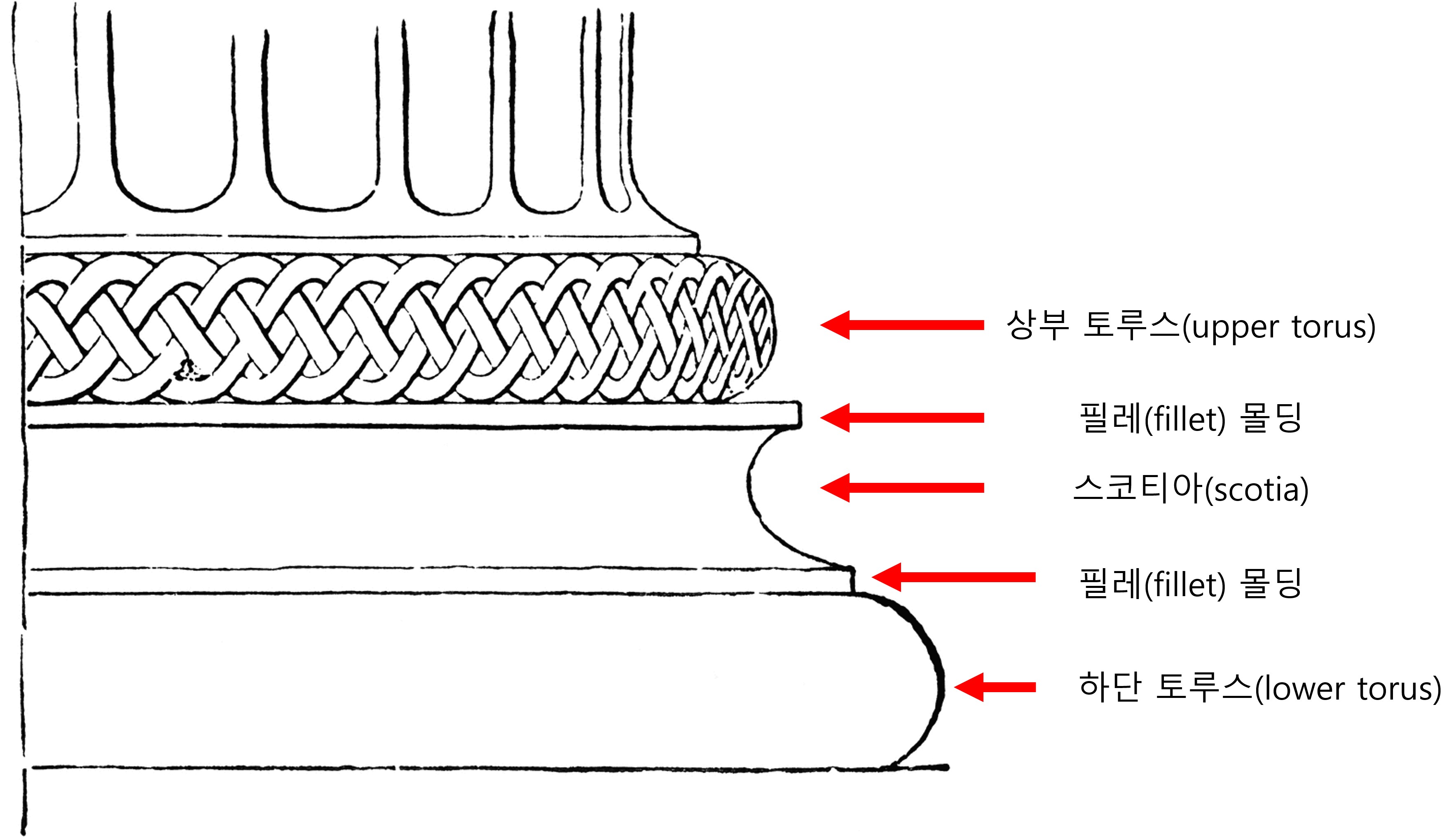 사전에서 정의하는 몰딩(molding)은 건축 표면에서 돌출되거나 함몰된 연속적인 띠를 말한다.<사진 1> 기능적으로 몰딩은 어떤 요소가 다른 것으로 바뀌는 중간단계(transition)를 덮으려는 목적을 갖는다. 몰딩은 건축의 외관에서 시작되었다. 예를 들어 고전 건축의 기둥에서 주초(base)는 상단 토루스(upper torus)와 하단 토루스(lower torus)로 구성되어 있고, 그 사이에는 ‘스코티아(scotia)’라는 전환점이 있다.<사진 2> 스코티아는 오목 몰딩에 해당한다. 스코티아는 위로는 상단 토루스와 만나고, 밑으로는 하단 토루스와 만난다. 스코티아가 토루스와 만나는 지점에도 전환점으로서 돌출된 몰딩이 있다. 이 몰딩을 ‘필레(fillet)’라고 한다. 스코티아도 몰딩이지만, 스코티아가 토루스와 만나는 지점 역시도 몰딩인 것이다.