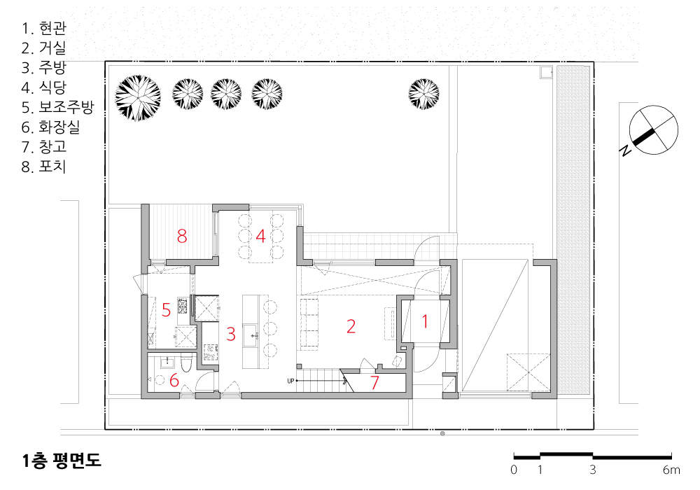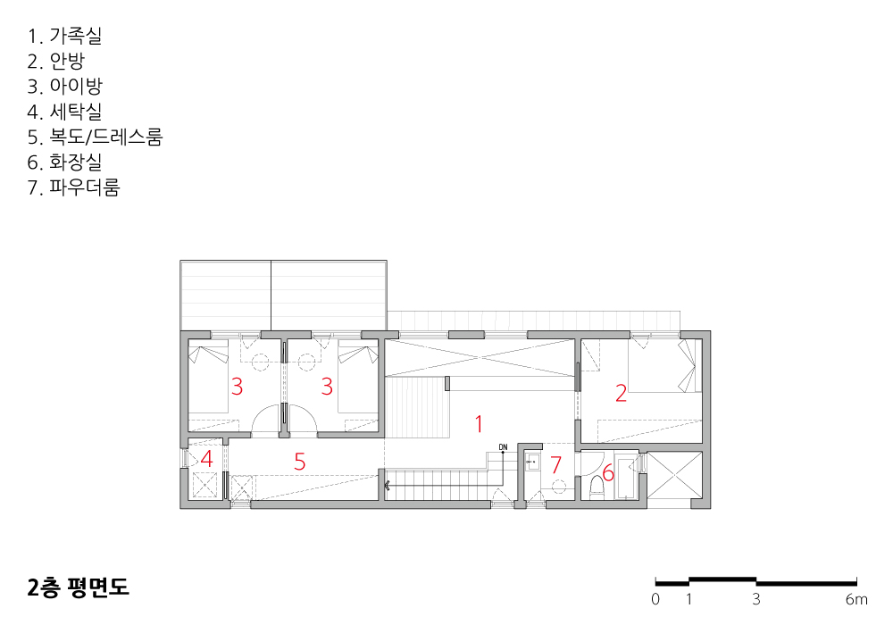 차고와 연결된 입구를 지나 현관에 들어서면 마당으로 시선이 열려있고 왼편으로 돌아서면 2층까지 열린 좁은 오픈공간이 밝게 펼쳐지고 거실과 주방을 마주하게 된다. 복도방향으로 길게 찢어진 오픈공간을 통해 깊이감을 만들어 동선에 활력을 주려고 했다. 주방은 단차를 두고 거실과 구분되어 있고 복도에서는 잘 보이지 않는 식당이 포치와 함께 마당으로 이어진다. 2층으로 올라오면 난간 너머로 공원이 보이는 넓은 복도가 안방과 아이방 사이에 위치한다. 복도의 한쪽엔 유리난간으로 된 평상이 있어 2층에서도 여유와 편안함을 느낄 수 있는 공간으로 계획되었다.