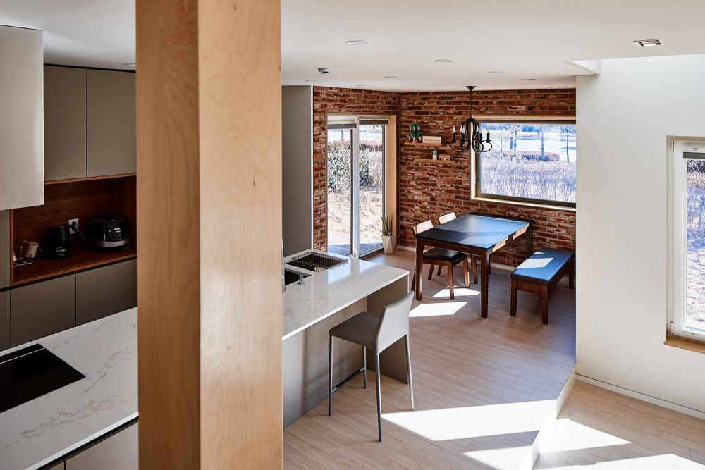 When you enter the porch through the entrance connected to the garage, it opens to the yard. And when you turn left, a narrow open space that opens up to the second floor spreads brightly, facing the living room and the kitchen. We intended to vitalize the movement flow line by creating a sense of depth with a long-open space in the direction of the hallway. A floor-level difference separates the kitchen from the living room. A restaurant is invisible from the hallway and leads to the yard as well as the porch. When you go up to the second floor, there is a large hallway overlooking the park between the master bedroom and their child's room. There is a deck with a glass railing on one side of the hall so that they can feel relaxed and comfortable on the second floor.
