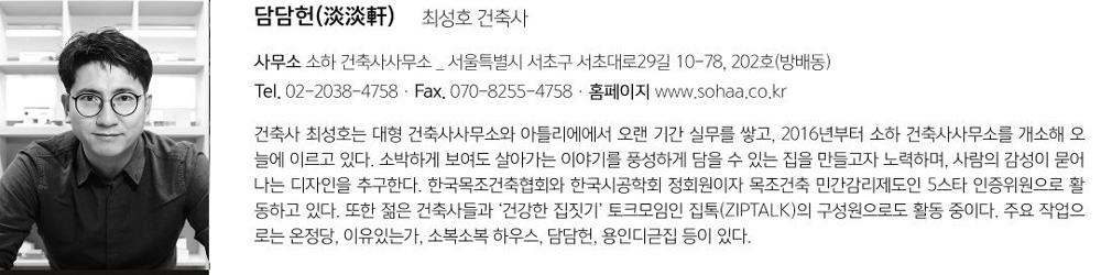 | 담담헌(淡淡軒) 설계자 | 최성호 _ 소하 건축사사무소 건축주 | 박주임, 최신규 감리자 | 최성호 _ 소하 건축사사무소 시공사 | HNH건설 대지위치 | 충청남도 아산시 배방읍 용연동길70번길 5 주요용도 | 단독주택 대지면적 | 260.00㎡ 건축면적 | 89.79㎡ 연면적 | 160.21㎡ 건폐율 | 34.53% 용적률 | 61.62% 규모 | 지상 2층 구조 | 경량목구조 외부마감재 | 스타코(파렉스), 파벽돌 내부마감재 | 합지, 벽돌타일 설계기간 | 2018. 01 ~ 2018. 04 공사기간 | 2018. 05 ~ 2018. 11 사진 | 이한울 _ 나르실리온 전문기술협력 - 구조분야 : (주)위너스BDG - 기계설비분야 : (주)태영E.M.C - 전기분야 : (주)태영E.M.C - 소방분야 : (주)태영E.M.C |