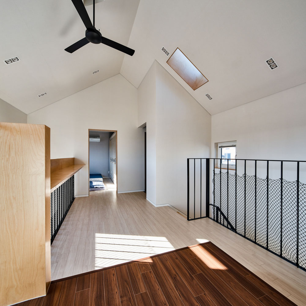 Since it is not easy to have openness in the small house, we constructed an open space or a straight staircase to make the length of gaze long. Although it is a small space, we tried to build a house where the gaze stays in space using some techniques, such as installing windows or openings at the end of the corridor or extending the gaze to the outside using glass railings.