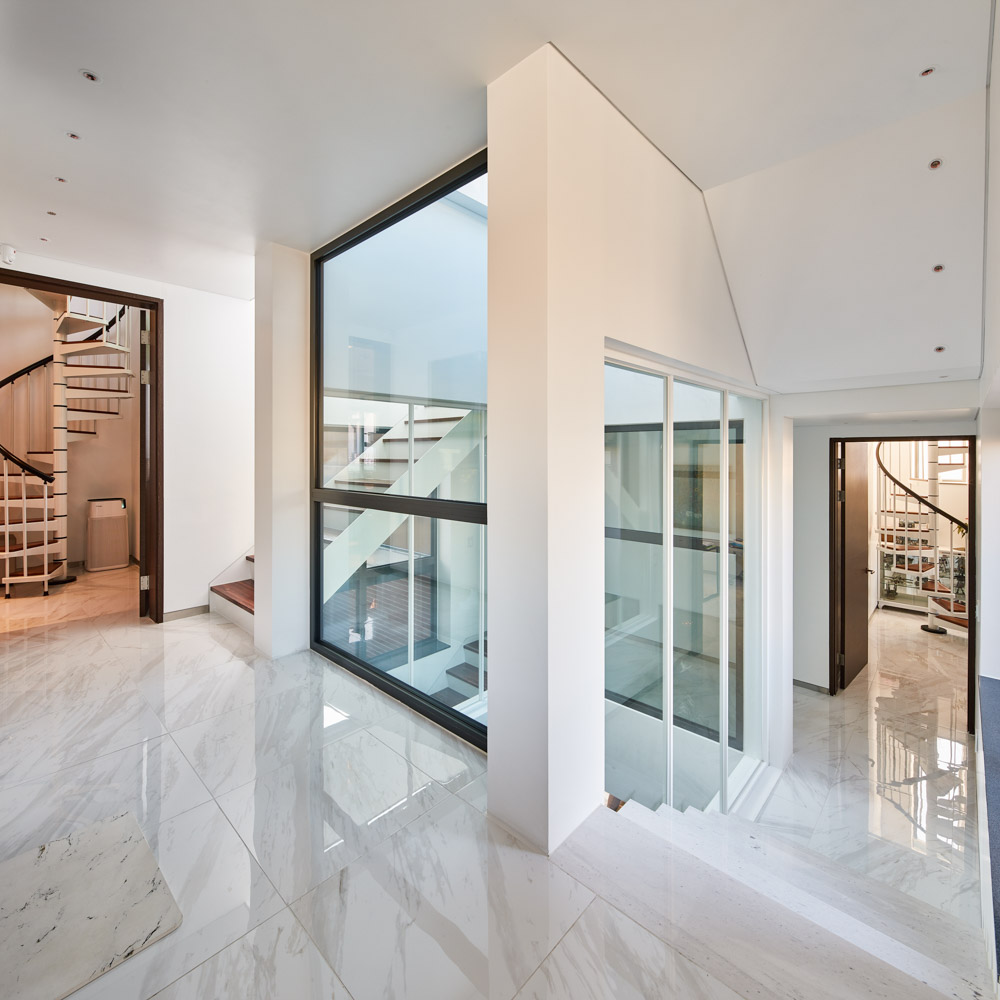 외부의 스테인레스 스틸과 오밀조밀하게 맞물린 벽돌의 마감이 주는 느낌은 견고하고 외부로 부터 가족 구성원들을 지켜준다. 하지만 현관을 열고 내부에 들어서면 화이트 톤으로 이루어진 대리석 바닥과 하얀 벽면의 조화는 외부와 반전을 일으키고, 밖에서 볼 수 없었던 실내 정원이 시간마다 달라지는 빛의 다채로움으로 풍성한 공간감을 더 해 준다. 지하 주차장으로 자연스레 생겨난 단차는 중정을 중심으로 배치된 각 실들을 물 흐르듯 유기적으로 연결해 준다.