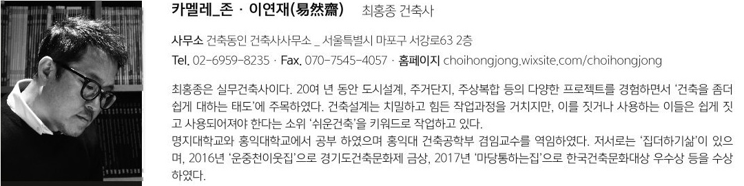 카멜레_존 설계자 | 최홍종 _ 건축동인 건축사사무소 건축주 | 정미현 _ 데코뷰 감리자 | 최홍종 _ 건축동인 건축사사무소 시공사 | 이명길 _ 주식회사 다산종합건설 설계팀 | 전봉수 대지위치 | 서울시 마포구 상수동 262-2외 주요용도 | 제2종근린생활시설(사무소) 대지면적 | 503.46㎡ 건축면적 | 287.14㎡ 연면적 | 1,620.01㎡ 건폐율 | 57.03% 용적률 | 199.15% 규모 | 지하 3층, 지상 5층 구조 | 철근콘크리트조 외부마감재 | 우성벽돌(고갱화이트), 씨블럭(고갱화이트), 럭스틸 내부마감재 | 콘크리트 면갈기위 투명하드너, 노출천정 설계기간 | 2018. 02. ~ 2018. 07 공사기간 | 2018. 09. ~ 2019. 12 사진 | 윤동규, 강총명 전문기술협력 - 구조분야 : 성진구조 - 기계설비분야 : 성신설비 - 전기분야 : 극동기술단 |