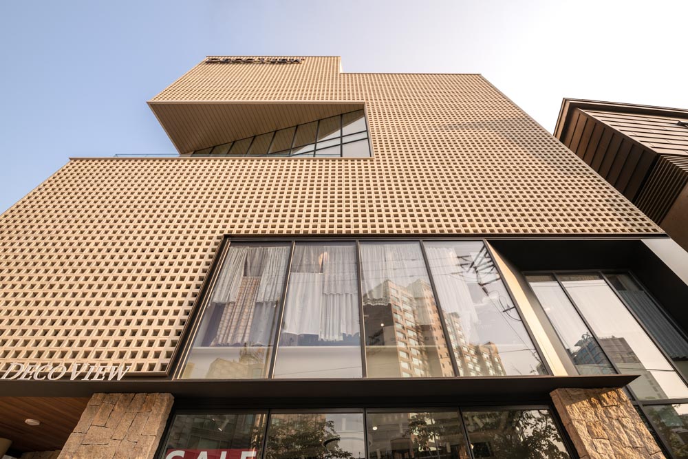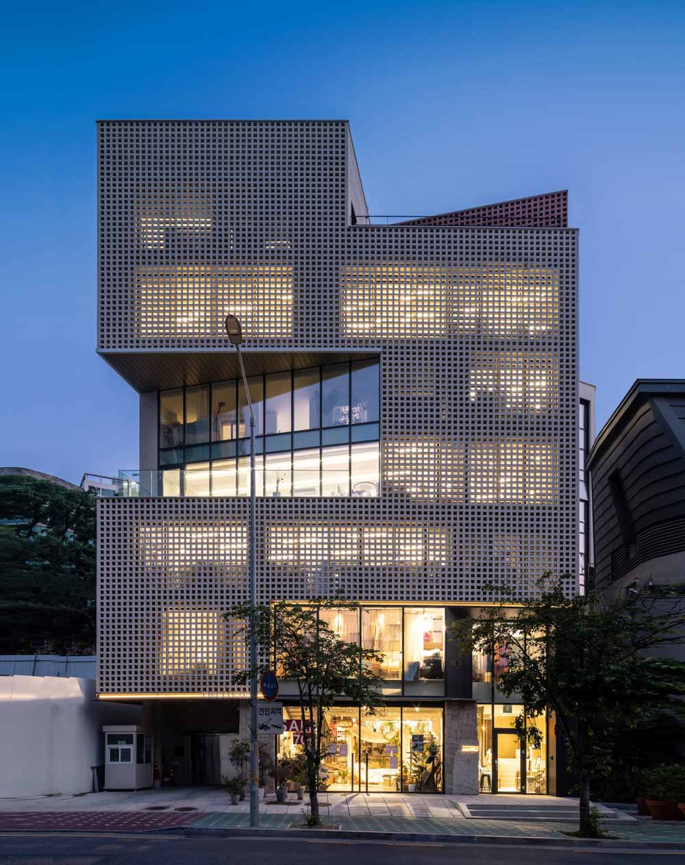 Irregular lot lines created rather dynamic plans, which are naturally developed into three-dimensional cross-sections. From my experiences that it is challenging to standardize the exterior materials of an irregular mass building, we decided brick as the primary material. Brick is meaningful as humanity's first building material. Furthermore, It's a beautiful material to be applied to this building in that small cells gather to form a mass. It was also a suitable material to form a translucent layer on the south side facing a street, depending on a brickwork method. After careful consideration, we used so-called white Gauguin bricks made of baked white bricks as the primary material. The façade translucent layer had a masonry structure of perforated brickwork. We decided to develop a new material because the safety of the opening scale and the masonry of the 5th-floor height were not proven. We developed a new type of brick, C Block, with white soil with the same physical properties and a translucent feeling (with a more full opening, instead of perforated brickwork). This material, which covers almost all of the façade, was developed together with WooSung Brick. Studying structural stability was interesting, and is expected to have a significant influence on future projects.