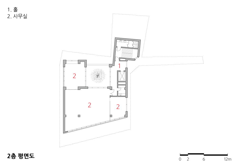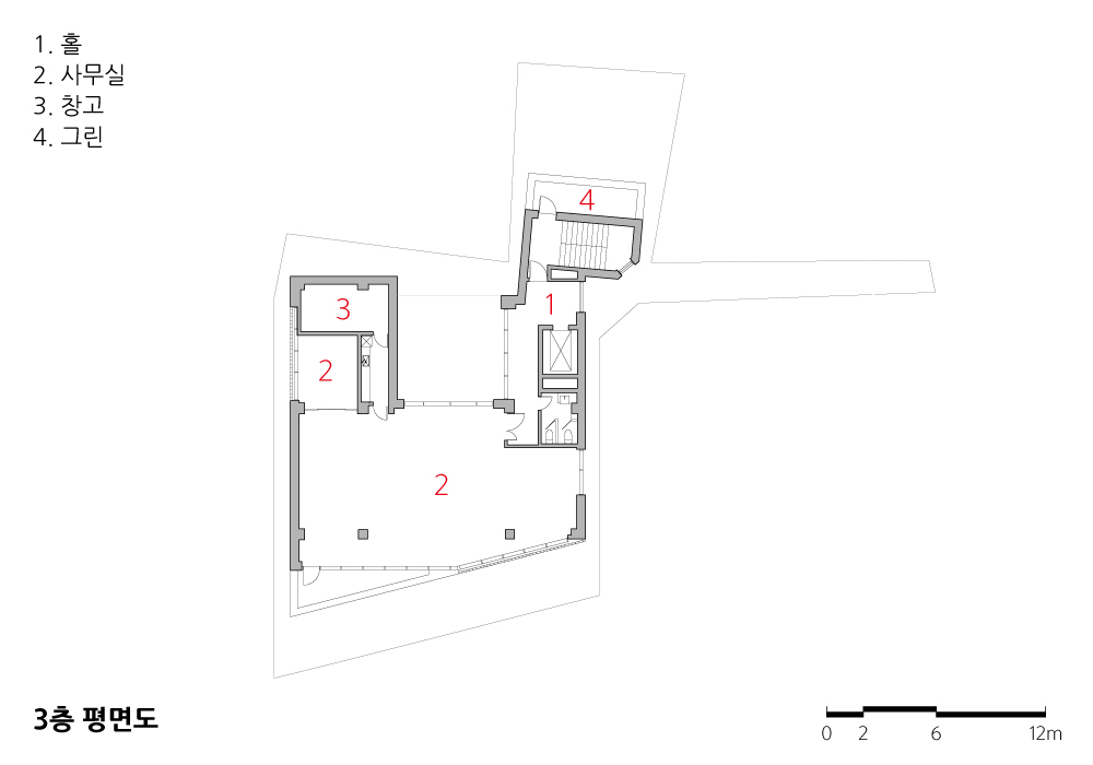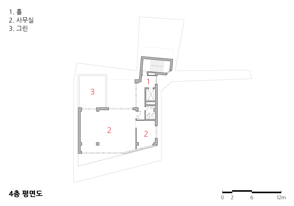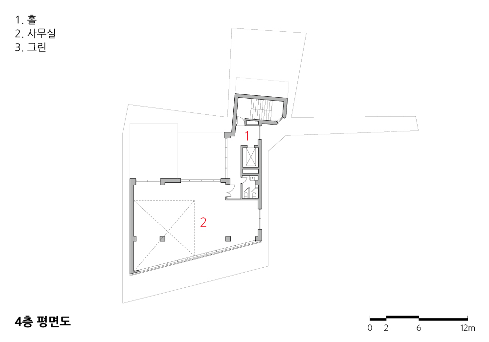 대지는 2종일반주거지역으로 일조권의 제약과 불규칙한 지적선에 의하여 다양한 층별 평면을 갖게 되었다. 최대의 용적을 확보하면서 변화에 대응가능한 공간의 계획은 아이러니하게도 일조권 사선제한이라는 규제에 의해서 탄생되었고 이는 변화무쌍한 건축물에 상당한 기여(?)를 하게 된다.
